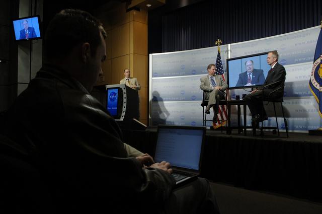 NASA Administrator Michael Griffin, second from left, and Associate Administrator for Space Operations William Gerstenmaier, right, look on as Space Shuttle Program Manager Wayne Hale speaks from NASA's Marshall Space Flight Center during a media briefing about the space shuttle program and processing for the STS-121 mission, Friday, April 28, 2006, at NASA Headquarters in Washington. Moderator Dean Acosta looks on af far left. Photo Credit (NASA/Bill Ingalls)