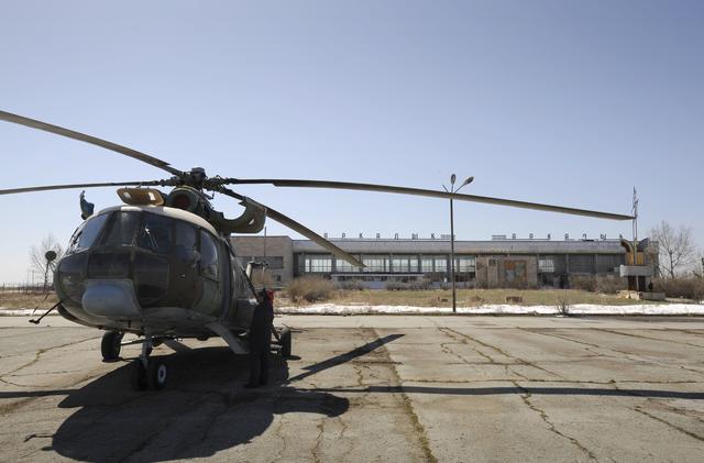 A Russian Search and Rescue helicopter waits for refueling at the Arkalyk airport in Kazakhstan prior to taking off for the landing of the Soyuz TMA-11 spacecraft carrying Expedition 16 Commander Peggy Whitson, Flight Engineer and Soyuz Commander Yuri Malenchenko and South Korean spaceflight participant So-yeon Yi, Friday, April, 19, 2008. The Soyuz made a ballistic landing, touching down more then 400 kilometers short of the intended target in central Kazakhstan. Photo Credit: (NASA/Bill Ingalls)