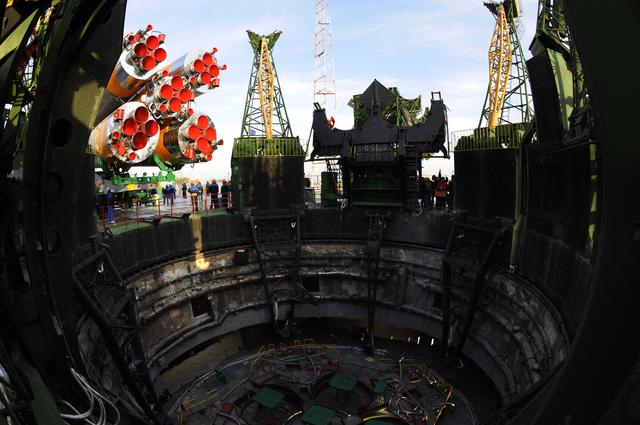 The Soyuz TMA-13 spacecraft arrives at the launch pad at the Baikonur Cosmodrome in Kazakhstan, Friday, Oct. 10, 2008. The Soyuz is scheduled to launch to the International Space Station Oct. 12 with Expedition 18 Commander Michael Fincke, Flight Engineer Yuri V. Lonchakov and American spaceflight participant Richard Garriott. The three crew members will dock their Soyuz to the International Space Station on Oct. 14. Fincke and Lonchakov will spend six months on the station, while Garriott will return to Earth Oct. 24 with two of the Expedition 17 crew members currently on the International Space Station. Photo Credit: (NASA/Bill Ingalls)