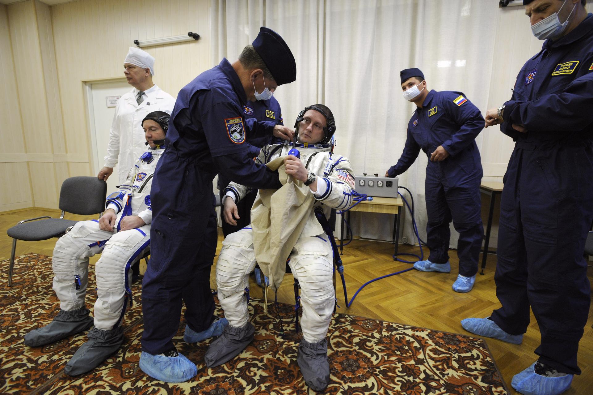 Expedition 18 Flight Engineer Yuri V. Lonchakov, left, and Expedition 18 Commander Michael Fincke don their Russian Sokol suits hours before they and American spaceflight participant Richard Garriott launch in the Soyuz TMA-13 spacecraft, Sunday, Oct. 12, 2008 from the Baikonur Cosmodrome in Kazakhstan. The three crew members are scheduled to dock with the International Space Station on Oct. 14. Fincke and Lonchakov will spend six months on the station, while Garriott will return to Earth Oct. 24 with two of the Expedition 17 crew members currently on the International Space Station. Photo Credit: (NASA/Bill Ingalls)