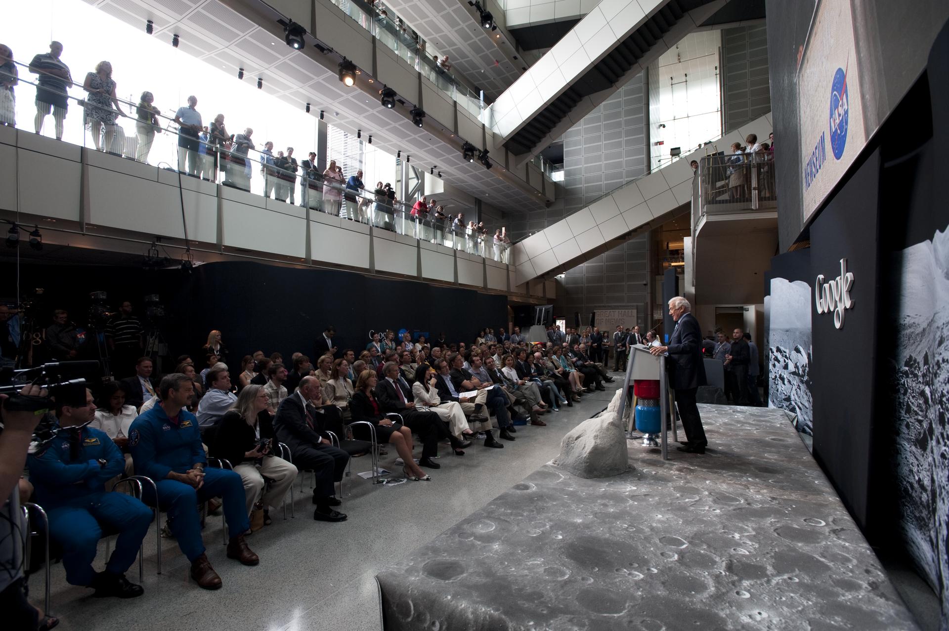 Apollo 11 astronaut Buzz Aldrin, the second man to walk on the Moon, speaks during a press conference, Monday, July 20, 2009, announcing the launch of Moon in Google Earth, an immersive 3D atlas of the Moon, accessible within Google Earth 5.0, Monday, July 20, 2009, at the Newseum in Washington. Photo Credit: (NASA/Bill Ingalls)