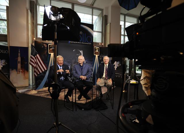 Apollo 11 astronaut Buzz Aldrin, the second man to walk on the Moon, seated left, responds to a question during a live television interview on Monday, July 20, 2009, at NASA Headquarters in Washington as Apollo 12 astronaut Alan Bean and Apollo 16 astronaut Charles Duke, right look on. The three sat in for interviews with morning talks shows covering the 40th Anniversary of the Apollo 11 landing on the Moon. Photo Credit: (NASA/Paul E. Alers)