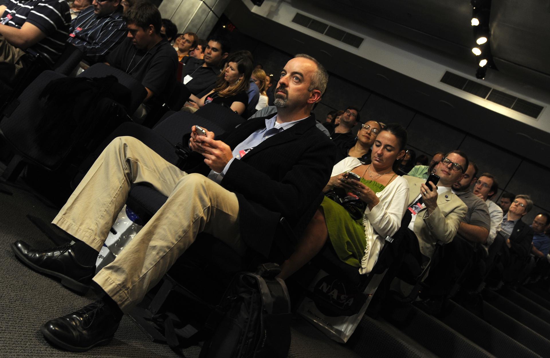 Guests at NASA Headquarters in Washington, DC prepare for a Tweetup on July 21, 2009. Nearly 200 of NASA’s Twitter followers are in attendance, which features a presentation and a question and answer session with the crew of the STS-125 shuttle mission to repair the Hubble Space Telescope. Photo Credit: (Carla Cioffi)
