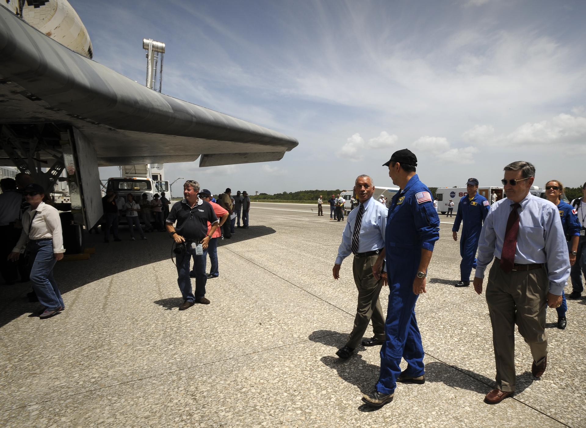 NASA Administrator Charles Bolden, left, STS-127 mission commander Mark Polansky, and NASA Kennedy Space Center Director Bob Cabana, right, walk around the space shuttle Endeavour shortly after it and its crew landed, Friday, July 31, 2009 at NASA's Kennedy Space Center in Cape Canaveral, Fla., completing a 16-day journey of more than 6.5 million miles. Endeavour delivered the final segment to the Japan Aerospace Exploration Agency's Kibo laboratory and a new crew member to the International Space Station. Photo Credit: (NASA/Bill Ingalls)