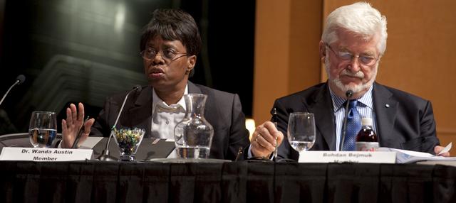 Dr. Wanda Austin, president and CEO of the Aerospace Corp., left, asks a question during the final meeting of the Human Space Flight Review Committee, Wednesday, Aug. 12, 2009, in Washington as committee member Bohdan Bejmuk reviews his notes. Photo Credit: (NASA/Paul E. Alers)