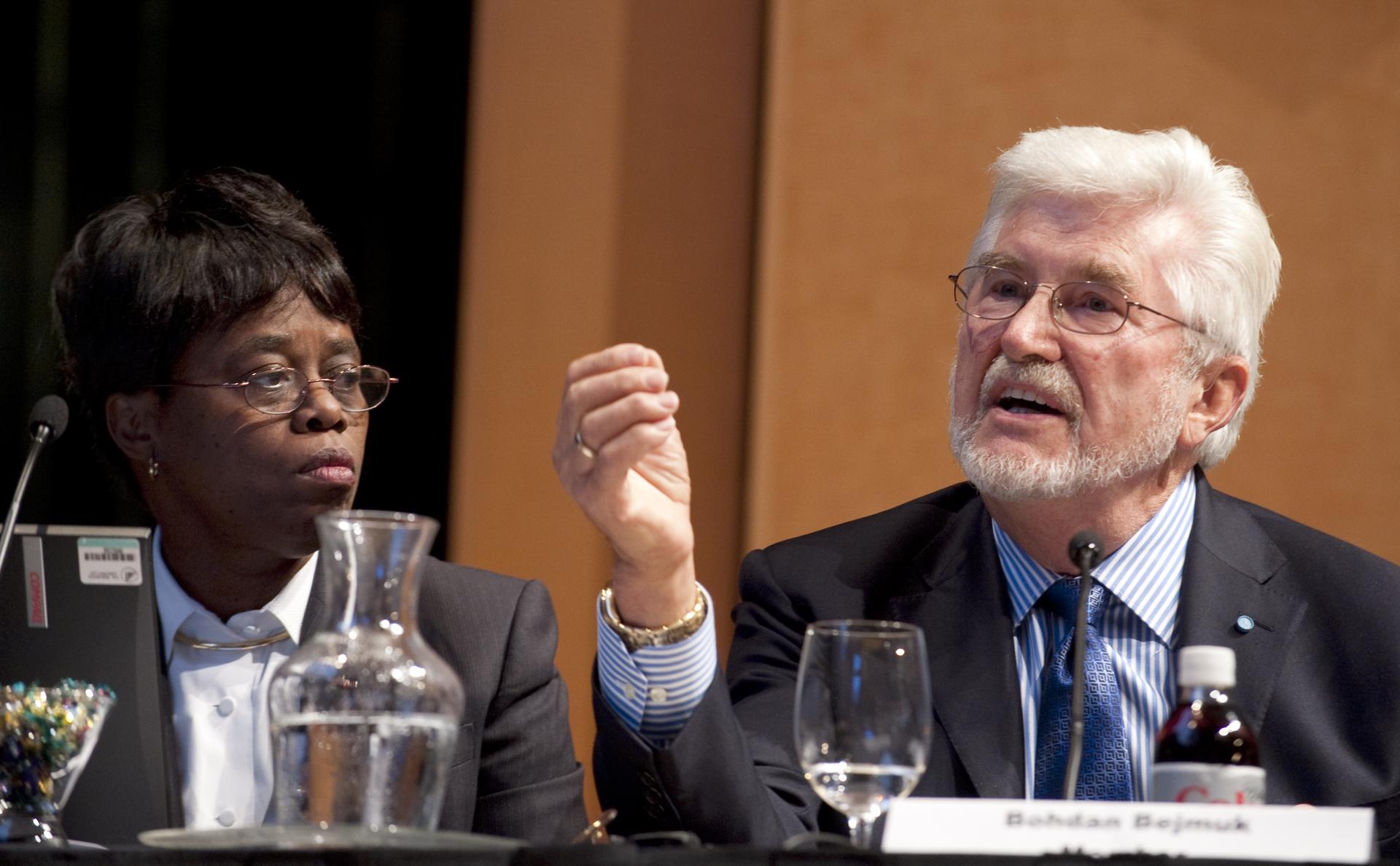 Bohdan Bejmuk, chair, Constellation program Standing Review Board, and former manager of the Boeing Space Shuttle and Sea Launch programs, right, asks a question during the final meeting of the Human Space Flight Review Committee as Dr. Wanda Austin, president and CEO, The Aerospace Corp., looks on at left, Wednesday, Aug. 12, 2009, in Washington. Photo Credit: (NASA/Paul E. Alers)