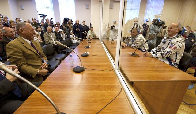 NASA Administrator Charles Bolden, left, laughs with Expedition 21 Flight Engineer Maxim Suraev, center, and Expedition 21 Flight Engineer Jeffrey N. Williams, right as Spaceflight Participant Guy Laliberté has his Russian Sokol suit pressure checked, Wednesday, Sept. 30, 2009 in Baikonur, Kazakhstan. Photo Credit: (NASA/Bill Ingalls)