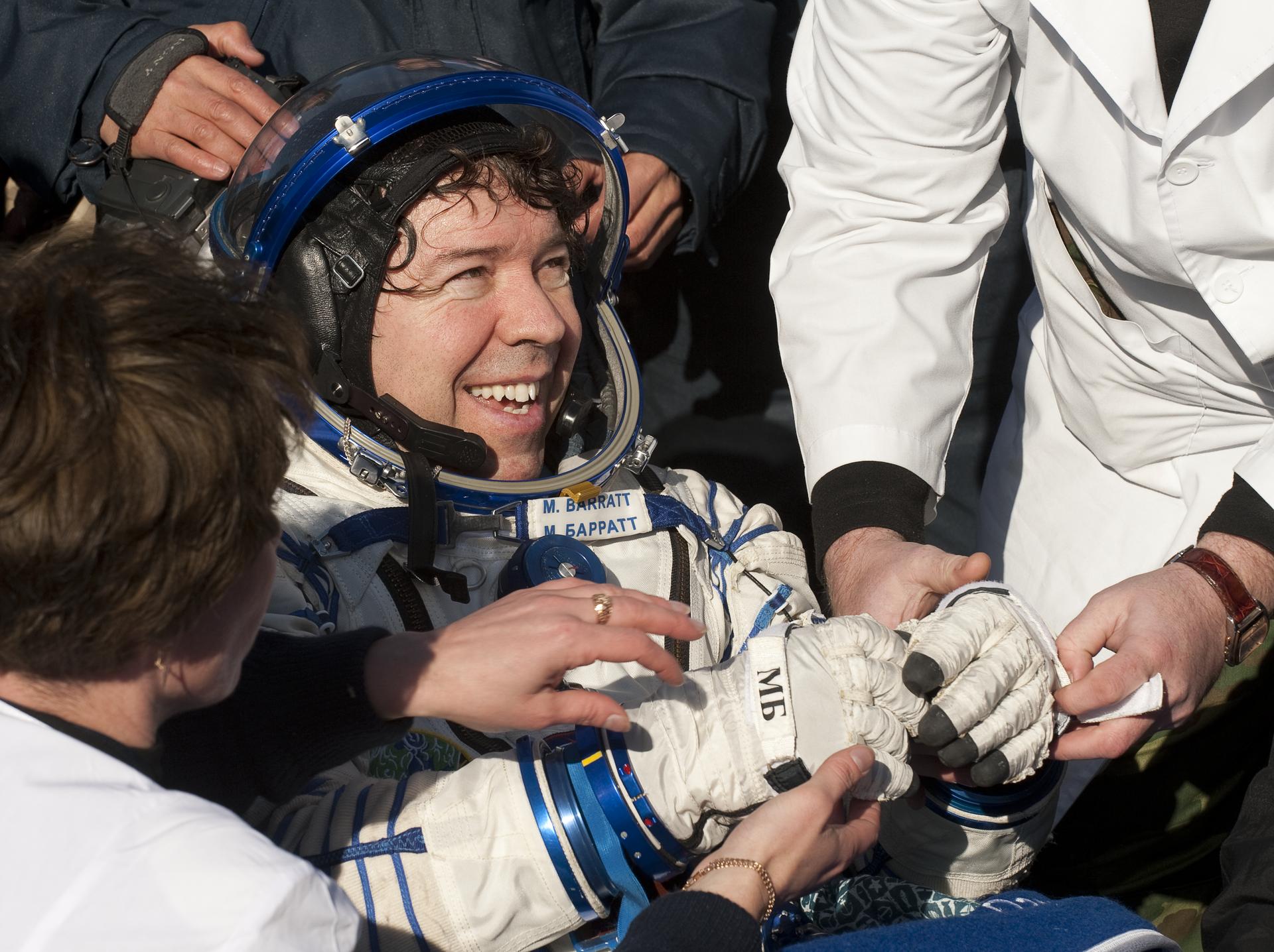 Expedition 20 Flight Engineer Michael Barratt rests in a chair shortly after he and Spaceflight participant Guy Laliberté, and Expedition 20 Commander Gennady Padalka landed in their Soyuz TMA-14 capsule near the town of Arkalyk, Kazakhstan on Sunday, Oct. 11, 2009. Padalka and Barratt are returning from six months onboard the International Space Station, along with Laliberté who arrived at the station on Oct. 2 with Expedition 21 Flight Engineers Jeff Williams and Maxim Suraev aboard the Soyuz TMA-16 spacecraft. Photo Credit: (NASA/Bill Ingalls)