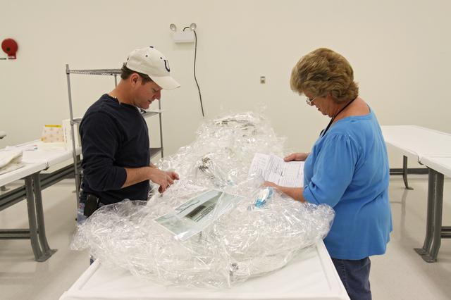 CAPE CANAVERAL, Fla. – In the Space Station Processing Facility at NASA's Kennedy Space Center in Florida, workers begin processing of the newly arrived replacement high-pressure ammonia jumper hoses to support space shuttle Endeavour's STS-130 mission. A problem arose during a prelaunch test Jan. 7 with one of four hoses that are needed to connect the ammonia loops of the International Space Station's Tranquility node to those of the Destiny laboratory. A decision was made to use an alternate hose design for use as the primary jumper. The new hoses are assembled from shorter hoses that were previously certified and tested. Connection of the modules requires two ammonia loops, with two lines apiece, each of which must be connected to both Tranquility and Destiny to route cooling to and from the Tranquility module. The primary payload for the STS-130 mission, Tranquility is a pressurized module that will provide additional room for crew members and many of the station's life support and environmental control systems. The node was built in Turin, Italy, by Thales Alenia Space for the European Space Agency. Endeavour's launch is set for Feb. 7. For information on the STS-130 mission and crew, visit http:__www.nasa.gov_mission_pages_shuttle_shuttlemissions_sts130_index.html. Photo credit: NASA_Jack Pfaller