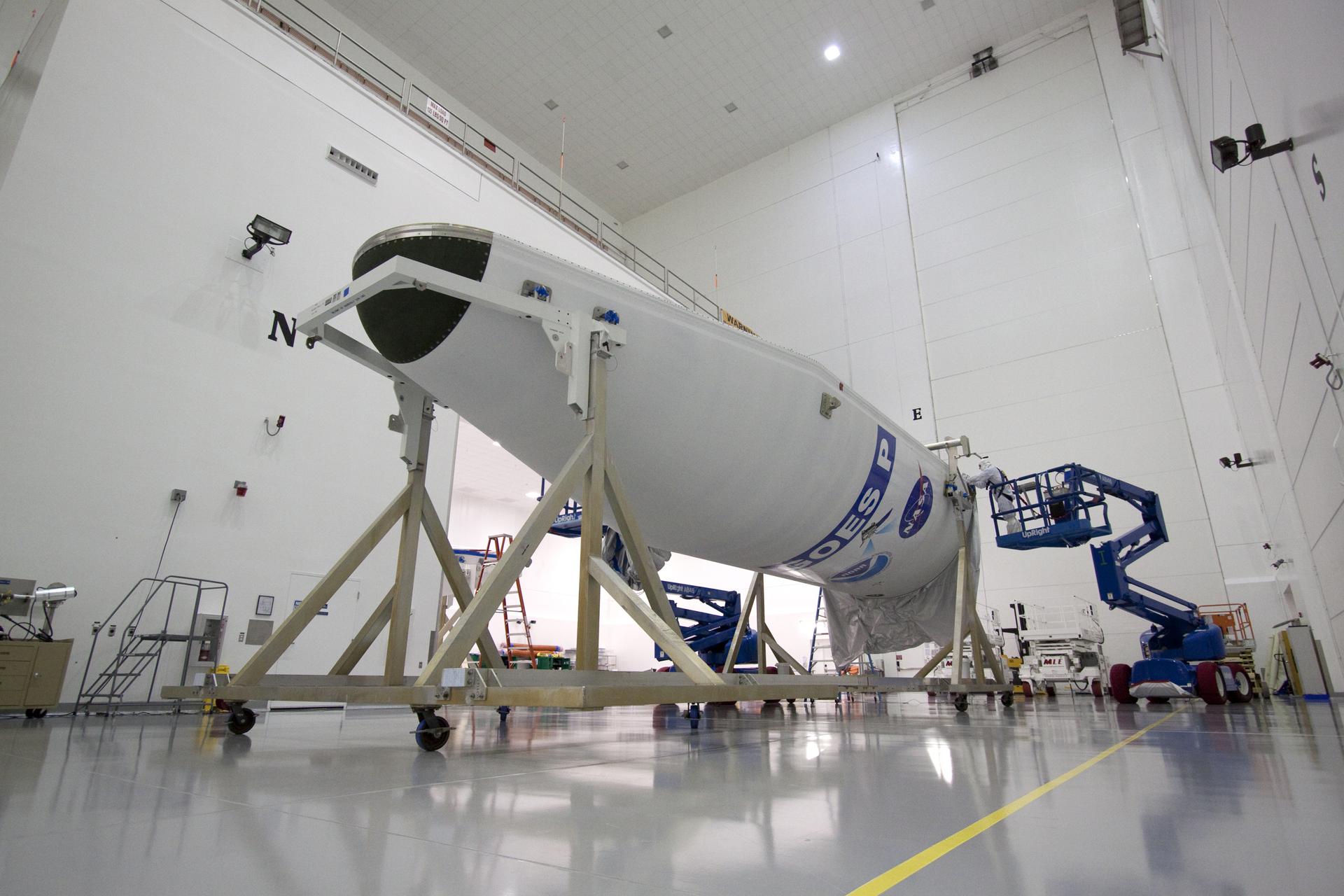 CAPE CANAVERAL, Fla. – At the Astrotech Space Operations facility in Titusville, Fla., the finishing touches are made to one side of the Delta IV payload fairing that will enclose NASA's GOES-P meteorological satellite. The fairing is a molded clamshell covering that fits flush with the outside surface of the rocket and forms an aerodynamic nose cone, protecting the spacecraft during launch and ascent. GOES-P, the latest Geostationary Operational Environmental Satellite, was developed by NASA for the National Oceanic and Atmospheric Administration, or NOAA. GOES-P is designed to watch for storm development and observed current weather conditions on Earth. Launch of GOES-P is targeted for March 1 from Launch Complex 37 aboard a United Launch Alliance Delta IV rocket. For information on GOES-P, visit http:__www.nasa.gov_mission_pages_GOES-P_main_index.html. Photo credit: NASA_Jack Pfaller