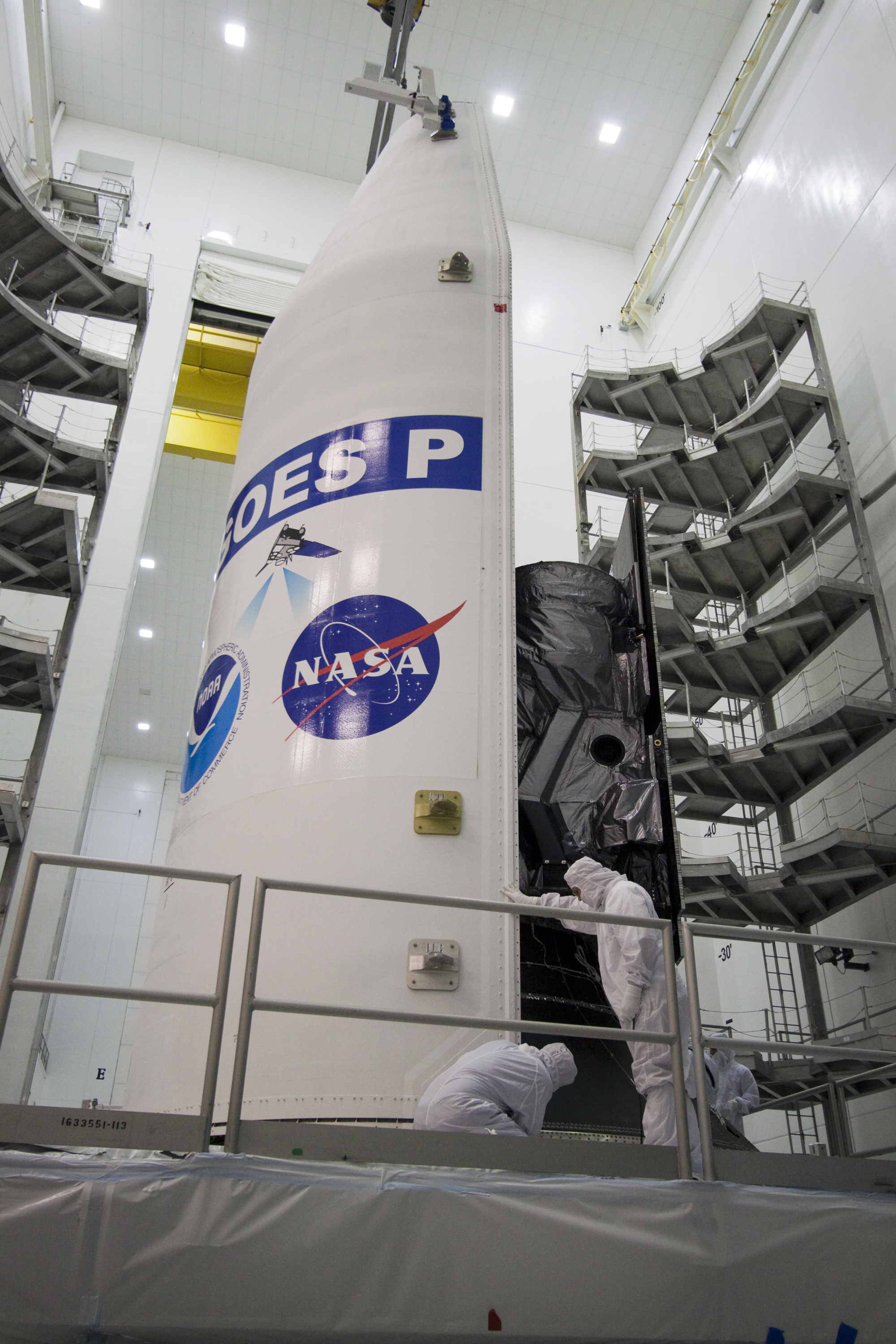CAPE CANAVERAL, Fla. – At the Astrotech Space Operations facility in Titusville, Fla., spacecraft technicians secure one side of the Delta IV payload fairing around NASA's GOES-P meteorological satellite. The fairing is a molded clamshell covering that fits flush with the outside surface of the rocket and forms an aerodynamic nose cone, protecting the spacecraft during launch and ascent. GOES-P, the latest Geostationary Operational Environmental Satellite, was developed by NASA for the National Oceanic and Atmospheric Administration, or NOAA. GOES-P is designed to watch for storm development and observed current weather conditions on Earth. Launch of GOES-P is targeted for March 1 from Launch Complex 37 aboard a United Launch Alliance Delta IV rocket. For information on GOES-P, visit http:__www.nasa.gov_mission_pages_GOES-P_main_index.html. Photo credit: NASA_Jack Pfaller
