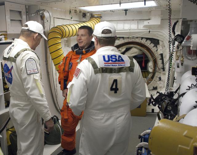CAPE CANAVERAL, Fla. - In the White Room at Launch Pad 39A on NASA's Kennedy Space Center in Florida, United Space Alliance suit technicians and NASA quality inspectors ensure the proper fit of the launch-and-entry suit of STS-130 Pilot Terry Virts as he prepares to enter space shuttle Endeavour for launch. This is the second launch attempt for space shuttle Endeavour's STS-130 crew. The first attempt on Feb. 7 was scrubbed due to unfavorable weather. The primary payload for the STS-130 mission to the International Space Station is the Tranquility node, a pressurized module that will provide additional room for crew members and many of the station's life support and environmental control systems. Attached to one end of Tranquility is a cupola, a unique work area with six windows on its sides and one on top. The cupola resembles a circular bay window and will provide a vastly improved view of the station's exterior. The multi-directional view will allow the crew to monitor spacewalks and docking operations, as well as provide a spectacular view of Earth and other celestial objects. The module was built in Turin, Italy, by Thales Alenia Space for the European Space Agency. Endeavour's launch is set for Feb. 8 at 4:14 a.m. EST. For information on the STS-130 mission and crew, visit http:__www.nasa.gov_mission_pages_shuttle_shuttlemissions_sts130_index.html. Photo credit: NASA_Sandra Joseph and Kevin O'Connell