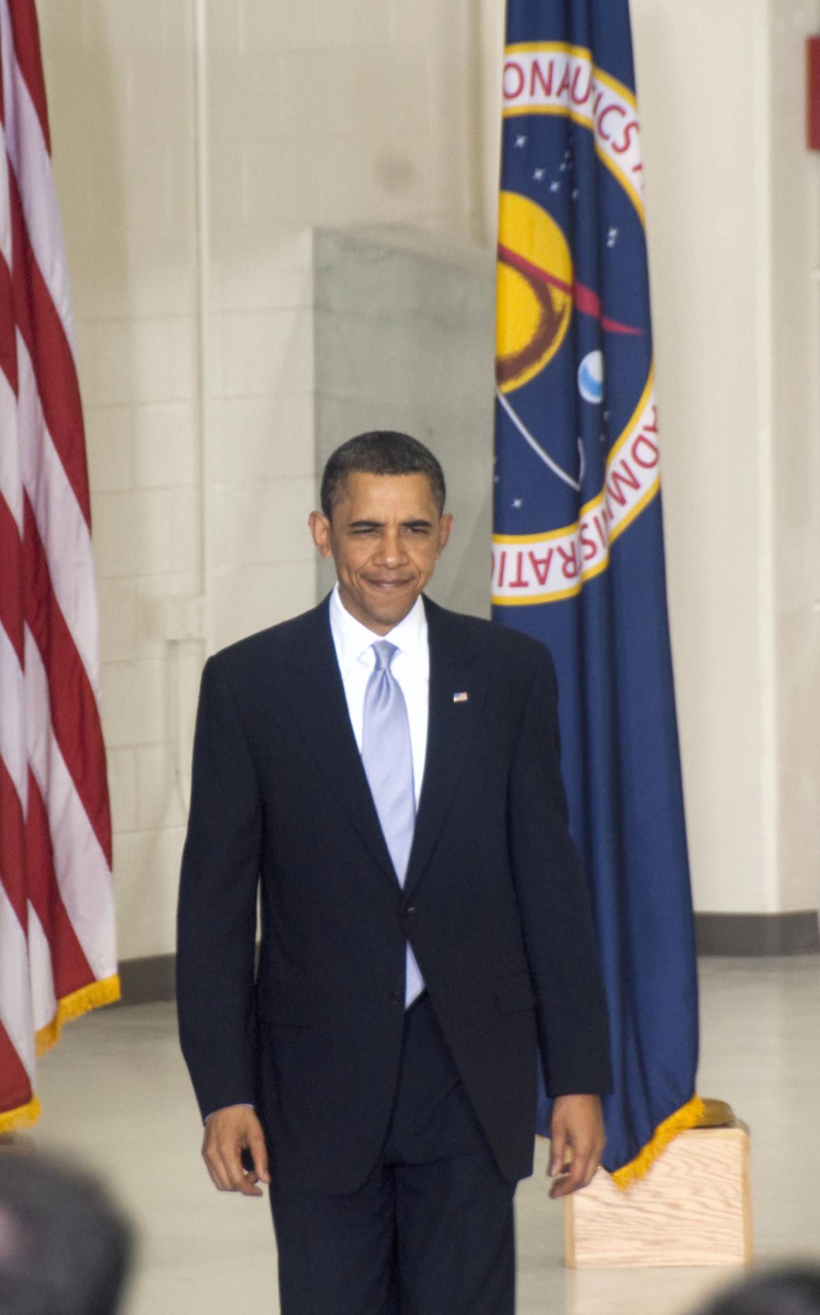 CAPE CANAVERAL, Fla. - CAPE CANAVERAL, Fla. - In the Operations and Checkout Building at NASA's Kennedy Space Center in Florida, President Barack Obama receives a warm welcome from the participants of the Conference on the American Space Program for the 21st Century. President Obama opened the conference with remarks on the new course his administration is charting for NASA and the future of U.S. leadership in human spaceflight. Photo credit: NASA_Jim Grossmann
