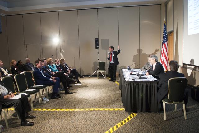 CAPE CANAVERAL, Fla. - In the Atlas_Redstone Room of the Debus Center at NASA's Kennedy Space Center Visitor Complex in Florida, Dr. Edward F. Crawley, Ford professor of engineering at MIT, speaks to the audience at the 'Expanding our Reach into the Solar System' break-out session, part of the Conference on the American Space Program for the 21st Century. The panel includes Scott Hubbard, former director of NASA's Ames Research Center (back to camera); John Holdren, assistant to the President for science and technology and director of the White House Office of Science and Technology Policy, panel moderator, and NASA Astronaut John Grunsfeld (obscured). Photo credit: NASA_Jim Grossmann