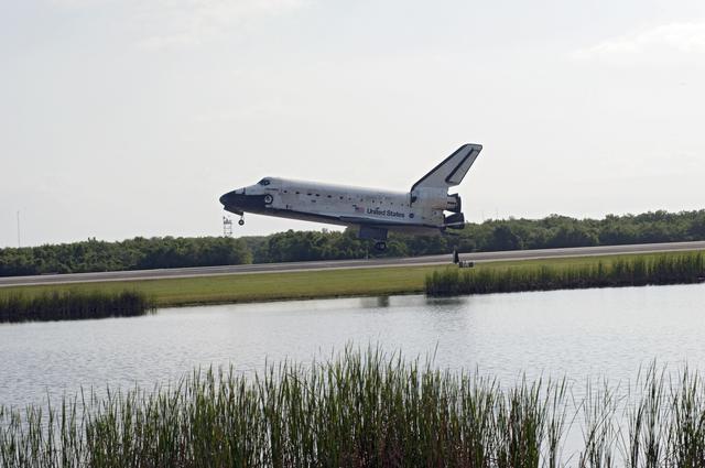 CAPE CANAVERAL, Fla. - Space shuttle Discovery appears to hover above the ground as it nears touchdown on Runway 33 at the Shuttle Landing Facility at NASA's Kennedy Space Center in Florida at 9:08 a.m. EDT, completing the 15-day STS-131 mission to the International Space Station. Main gear touchdown was at 9:08:35 a.m. EDT followed by nose gear touchdown at 9:08:47 a.m. and wheelstop at 9:09:33 a.m. Aboard are Commander Alan Poindexter; Pilot James P. Dutton Jr.; and Mission Specialists Rick Mastracchio, Clayton Anderson, Dorothy Metcalf-Lindenburger, Stephanie Wilson and Naoko Yamazaki of the Japan Aerospace Exploration Agency. The seven-member STS-131 crew carried the multi-purpose logistics module Leonardo, filled with supplies, a new crew sleeping quarters and science racks that were transferred to the International Space Station's laboratories. The crew also switched out a gyroscope on the station’s truss, installed a spare ammonia storage tank and retrieved a Japanese experiment from the station’s exterior. STS-131 is the 33rd shuttle mission to the station and the 131st shuttle mission overall. For information on the STS-131 mission and crew, visit http:__www.nasa.gov_mission_pages_shuttle_shuttlemissions_sts131_index.html. Photo credit: NASA_Chuck Tintera