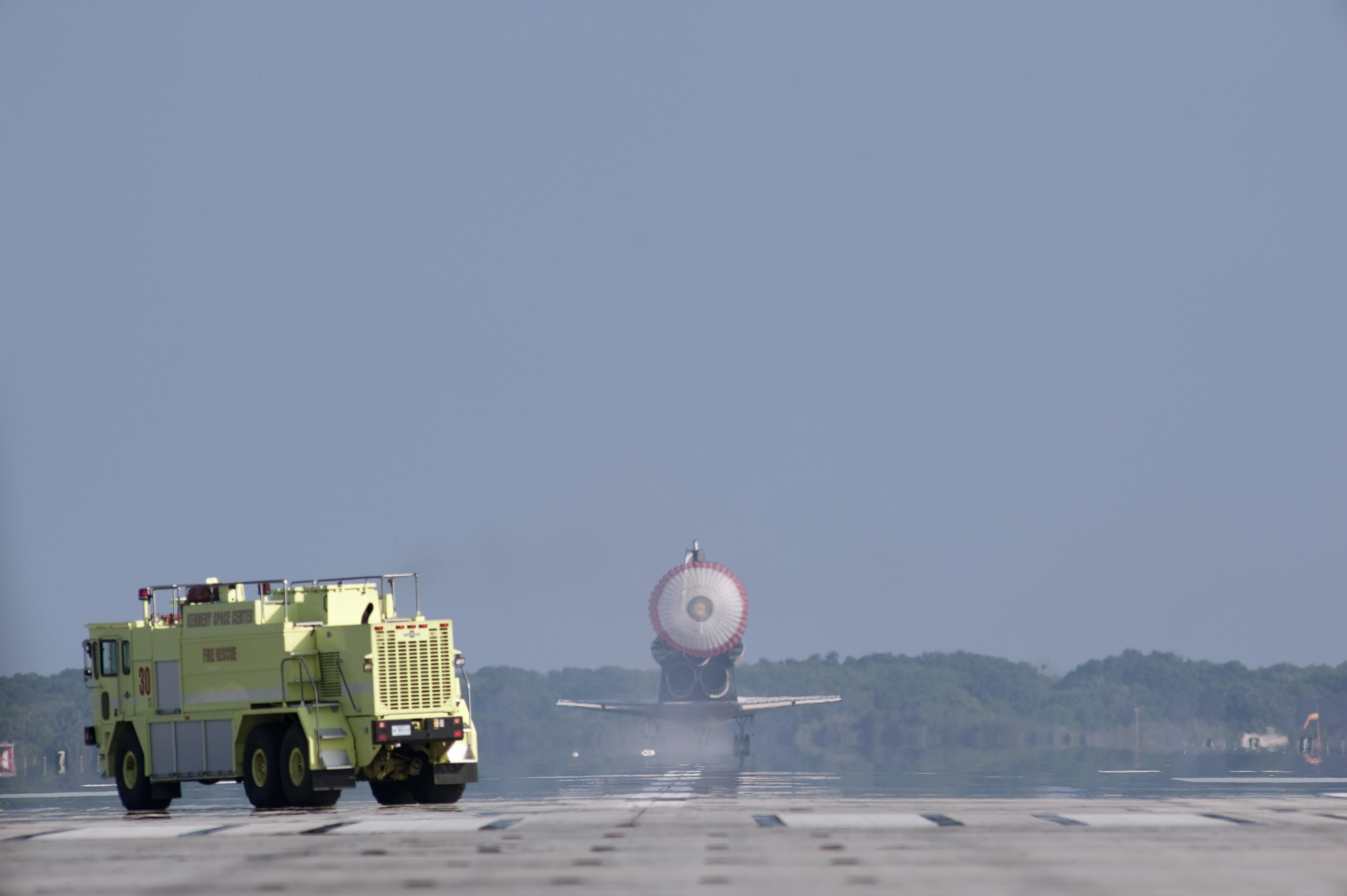 CAPE CANAVERAL, Fla. - With drag chute unfurled, space shuttle Discovery rolls past a fire rescue vehicle on Runway 33 as it lands at the Shuttle Landing Facility at NASA's Kennedy Space Center in Florida after 15 days in space, completing the more than 6.2-million-mile STS-131 mission on orbit 238. Main gear touchdown was at 9:08:35 a.m. EDT followed by nose gear touchdown at 9:08:47 a.m. and wheelstop at 9:09:33 a.m. Aboard are Commander Alan Poindexter; Pilot James P. Dutton Jr.; and Mission Specialists Rick Mastracchio, Clayton Anderson, Dorothy Metcalf-Lindenburger, Stephanie Wilson and Naoko Yamazaki of the Japan Aerospace Exploration Agency. The seven-member STS-131 crew carried the multi-purpose logistics module Leonardo, filled with supplies, a new crew sleeping quarters and science racks that were transferred to the International Space Station's laboratories. The crew also switched out a gyroscope on the station’s truss, installed a spare ammonia storage tank and retrieved a Japanese experiment from the station’s exterior. STS-131 is the 33rd shuttle mission to the station and the 131st shuttle mission overall. For information on the STS-131 mission and crew, visit http:__www.nasa.gov_mission_pages_shuttle_shuttlemissions_sts131_index.html. Photo credit: NASA_Tony Gray and Tom Farrar