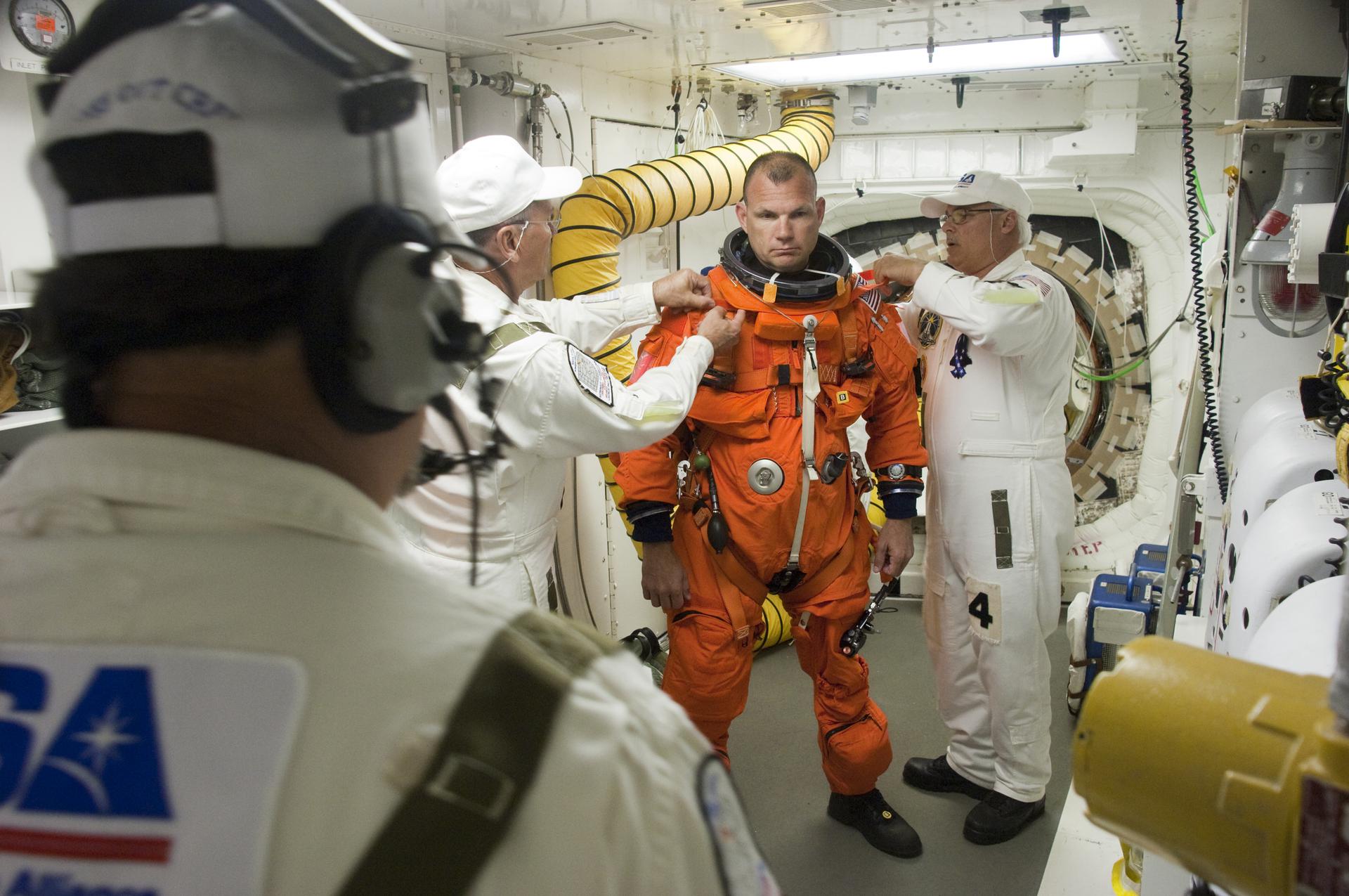 CAPE CANAVERAL, Fla. - At Launch Pad 39A at NASA's Kennedy Space Center in Florida, STS-132 Pilot Tony Antonelli prepares to enter space shuttle Atlantis from the pad's White Room. STS-132 is Antonelli's second spaceflight. The six-member STS-132 crew is participating in a dress rehearsal for launch, known as the Terminal Countdown Demonstration Test, from their seats in the crew compartment of Atlantis. Launch is targeted for 2:19 p.m. EDT on May 14. On the STS-132 mission, the crew will deliver an Integrated Cargo Carrier, or ICC, and the Russian-built Mini-Research Module-1, or MRM-1, to the International Space Station. The ICC is an unpressurized flat bed pallet and keel yoke assembly used to support the transfer of exterior cargo from the shuttle to the space station. The MRM-1, known as Rassvet, is the second in a series of new pressurized components for Russia and will be permanently attached to the Earth-facing port of the Zarya control module. Rassvet, which translates to 'dawn,' will be used for cargo storage and provide an additional docking port to the station. STS-132 is the 34th mission to the station and the 132nd shuttle mission overall. For information on the STS-132 mission, visit http:__www.nasa.gov_mission_pages_shuttle_shuttlemissions_sts132_index.html. Photo credit: NASA_Sandra Joseph and Kevin O'Connell