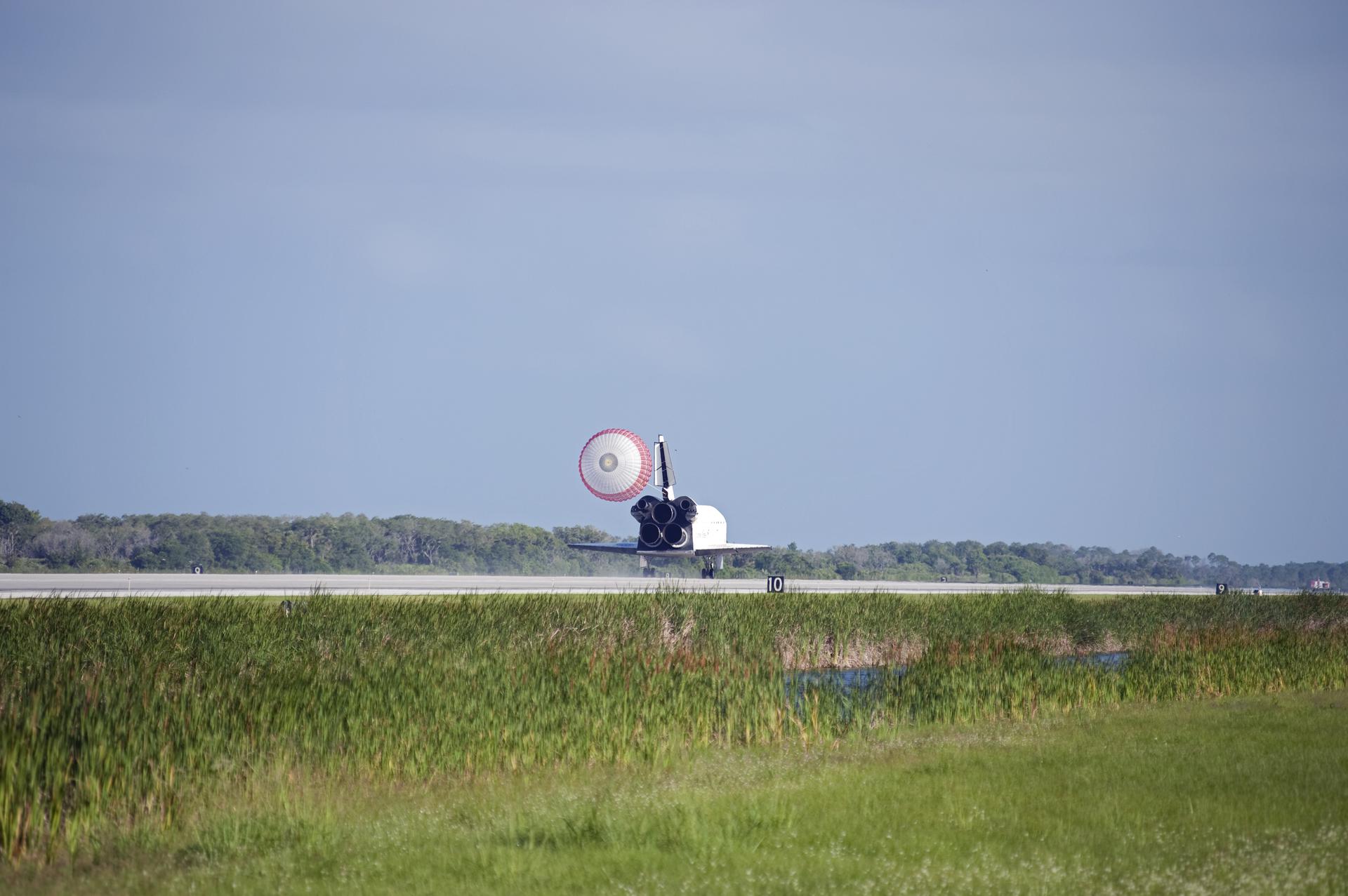 CAPE CANAVERAL, Fla. - Space shuttle Atlantis' drag chute slows the vehicle as it rolls down Runway 33 at the Shuttle Landing Facility at NASA's Kennedy Space Center in Florida. Landing was at 8:48 a.m. EDT, completing the 12-day STS-132 mission to the International Space Station. The six-member STS-132 crew carried the Russian-built Mini Research Module-1 to the space station. STS-132 is the 34th shuttle mission to the station, the 132nd shuttle mission overall and the last planned flight for Atlantis. For information on the STS-132 mission and crew, visit www.nasa.gov_mission_pages_shuttle_shuttlemissions_sts132_index.html. Photo credit: NASA_Thomas Farrar Jr.