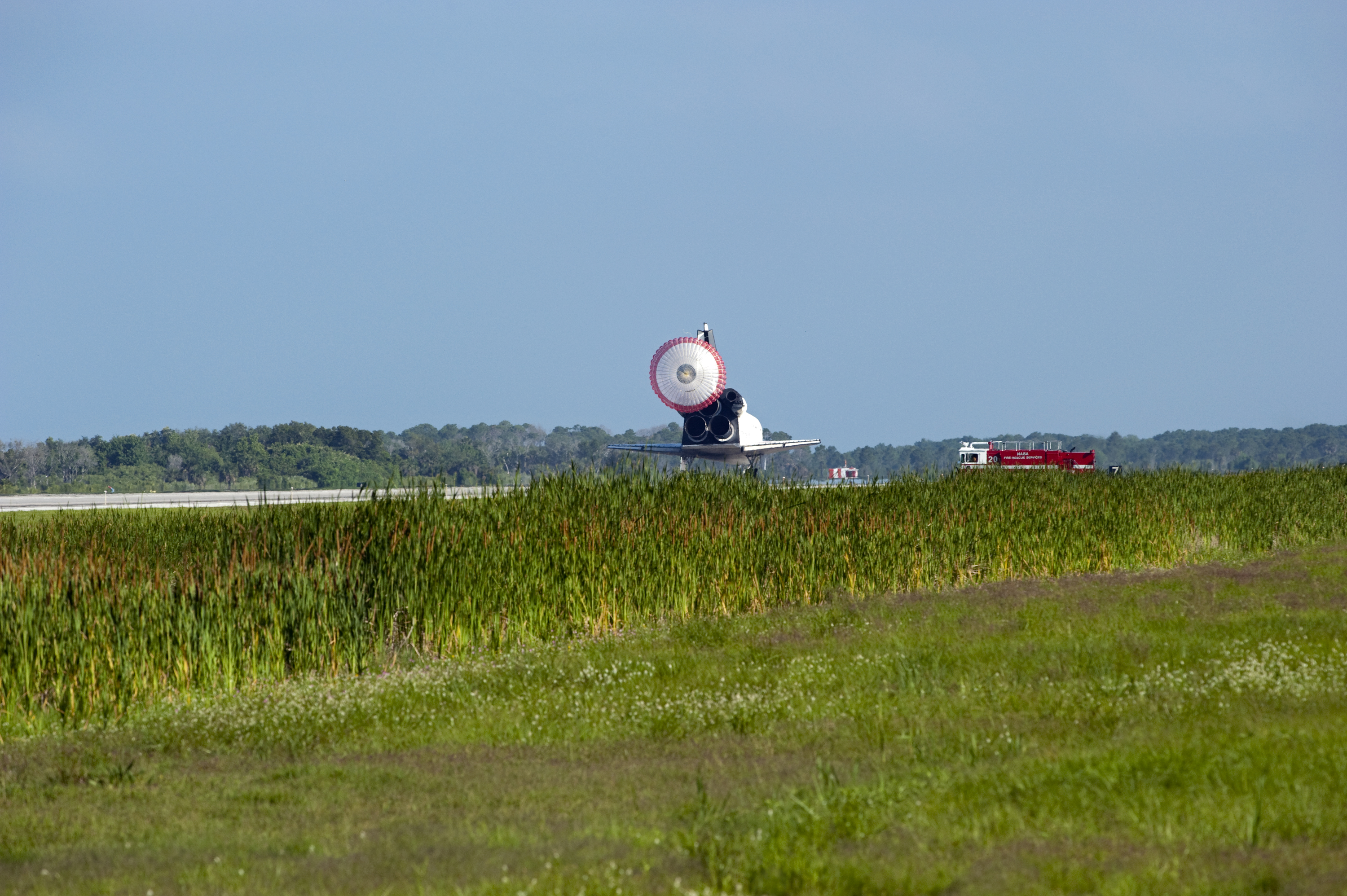 CAPE CANAVERAL, Fla. - Space shuttle Atlantis rolls to a stop as NASA's Fire Emergency Services vehicle approaches Runway 33 at the Shuttle Landing Facility at NASA's Kennedy Space Center in Florida. The emergency vehicle is part of a long convoy that greets every shuttle upon return to Earth. Landing was at 8:48 a.m. EDT, completing the 12-day STS-132 mission to the International Space Station. The six-member STS-132 crew carried the Russian-built Mini Research Module-1 to the space station. STS-132 is the 34th shuttle mission to the station, the 132nd shuttle mission overall and the last planned flight for Atlantis. For information on the STS-132 mission and crew, visit www.nasa.gov_mission_pages_shuttle_shuttlemissions_sts132_index.html. Photo credit: NASA_Tom Joseph