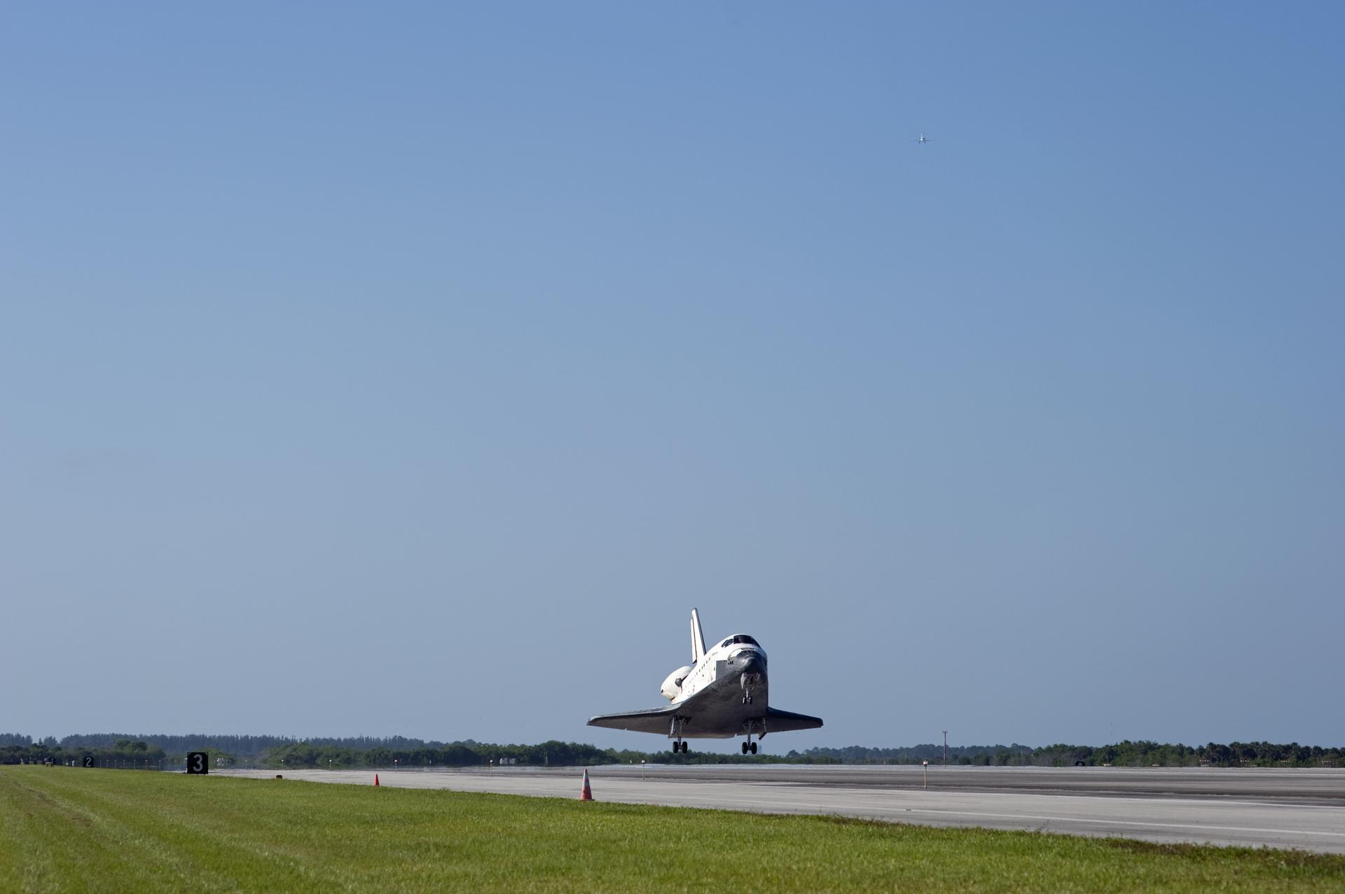 CAPE CANAVERAL, Fla. - A Shuttle Training Aircraft, or STA, top right, watches over space shuttle Atlantis as it touches down on Runway 33 at the Shuttle Landing Facility at NASA's Kennedy Space Center in Florida. The shuttle approached from the southeast in a crystal-clear blue sky, giving the Space Coast quite a show. Landing was at 8:48 a.m. EDT, completing the 12-day STS-132 mission to the International Space Station. The six-member STS-132 crew carried the Russian-built Mini Research Module-1 to the space station. STS-132 is the 34th shuttle mission to the station, the 132nd shuttle mission overall and the last planned flight for Atlantis. For information on the STS-132 mission and crew, visit www.nasa.gov_mission_pages_shuttle_shuttlemissions_sts132_index.html. Photo credit: NASA_Tony Gray and Tom Farrar
