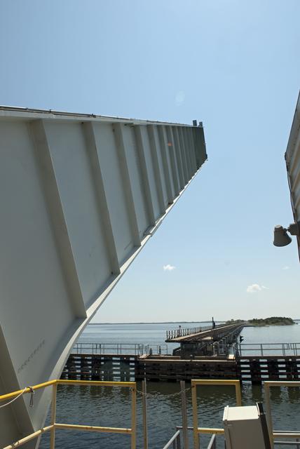 CAPE CANAVERAL, Fla. - The NASA Railroad draw bridge over the Indian River begins to close for the train carrying the last space shuttle solid rocket booster segments to NASA's Kennedy Space Center. Six cars transported the segments along the Florida East Coast Railway, which began at the ATK solid rocket booster plant in Promontory, Utah. The booster segments will be used for shuttle Atlantis on what currently is planned as the 'launch on need,' or potential rescue mission for the final shuttle flight, Endeavour's STS-134 mission. For information, visit www.nasa.gov_shuttle. Photo credit: NASA_Jim Grossmann