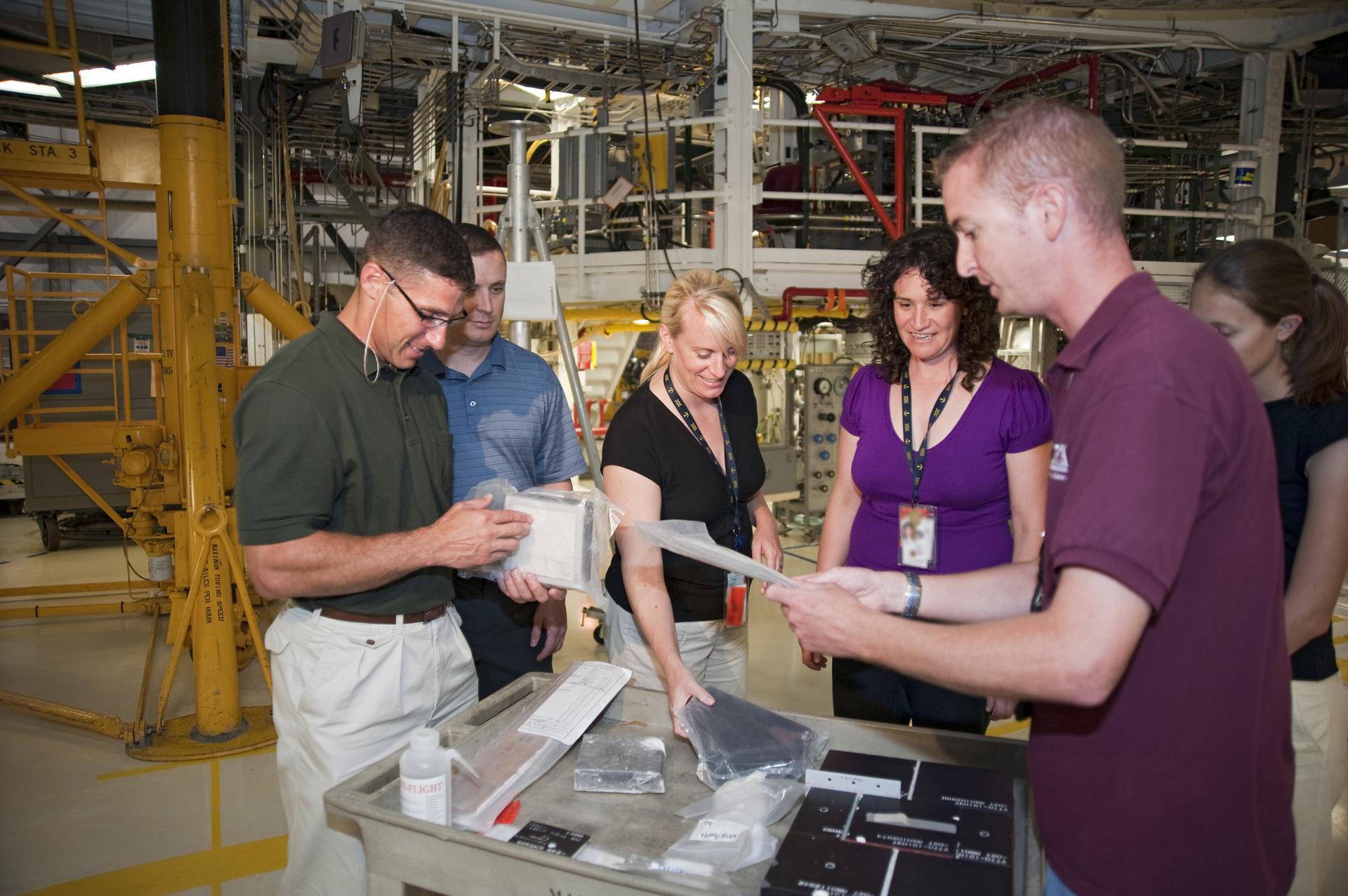 CAPE CANAVERAL, Fla. --- At NASA's Kennedy Space Center in Florida, the Class of 2009 Astronaut Candidates, also called ASCANs, check out heat shield tiles in Orbiter Processing Facility-1. Inside the facility, space shuttle Atlantis is being processed for the 'launch on need,' or potential rescue mission for the final scheduled shuttle flight, Endeavour's STS-134 mission. The new astronaut candidates for NASA are Serena M. Aunon, Jeanette J. Epps, Air Force Maj. Jack D. Fischer, Air Force Lt. Col. Michael S. Hopkins, Kjell N. Lindgren, Kathleen 'Kate' Rubins, Navy Cmdr. Scott D. Tingle, Army Lt. Col. Mark T. Vande, and Navy Lt. Cmdr. Gregory R. 'Reid' Wiseman. The new astronaut candidates for the Japan Aerospace Exploration Agency, or JAXA, are Norishige Kanai, Takuya Onishi and Kimiya Yui. The new astronaut candidates for the Canadian Space Agency, or CSA, are Jeremy Hansen and David Saint-Jacques. Photo Credit: NASA_Kim Shiflett
