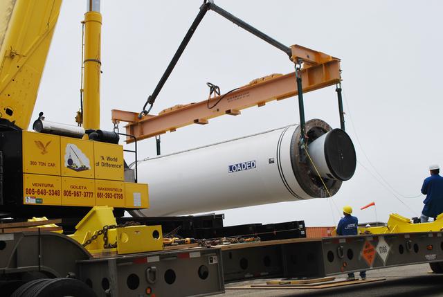 VANDENBERG AIR FORCE BASE, Calif. -- At Vandenberg Air Force Base in California, a crane lifts the Stage 0 motor for the Taurus XL launch vehicle for its move into Orbital Sciences' Hangar 1555. The motor will help carry NASA's Glory satellite into low Earth orbit. Glory is scheduled to launch in November from Vandenberg's Launch Pad SLC 576-E. Once Glory reaches orbit, it will collect data on the properties of aerosols and black carbon. It also will help scientists understand how the sun's irradiance affects Earth's climate. Photo credit: NASA_Randy Beaudoin, VAFB