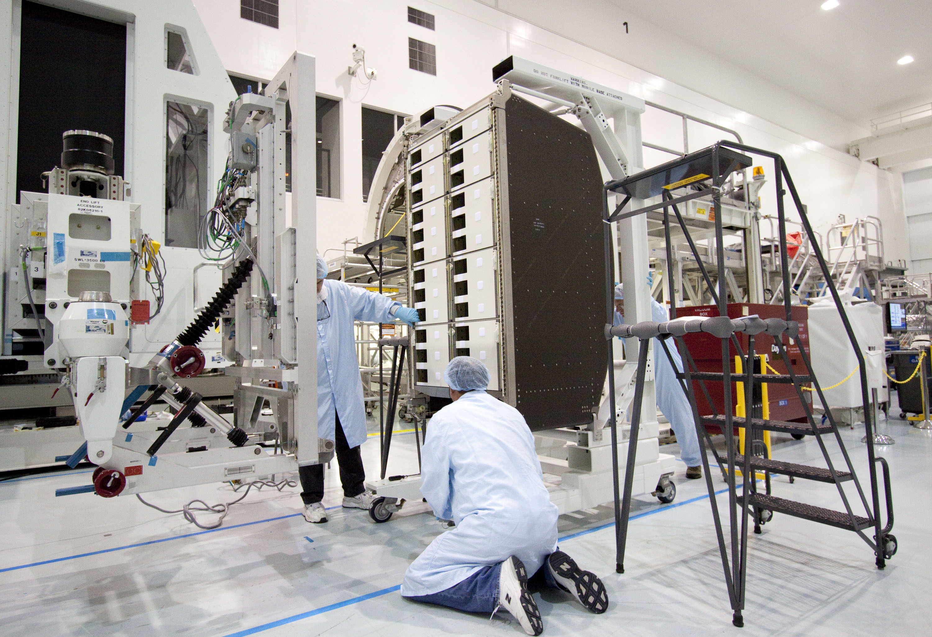 CAPE CANAVERAL, Fla. – In the Space Station Processing Facility at NASA's Kennedy Space Center in Florida, technicians prepare to install a resupply rack into the Permanent Multipurpose Module, or PMM. The Leonardo multi-purpose logistics module, or MPLM, is being modified to become the PMM that will carry supplies and critical spare parts to the International Space Station aboard space shuttle Discovery’s STS-133 mission. Discovery, targeted to launch Nov. 1, will leave the module behind so it can be used for microgravity experiments in fluid physics, materials science, biology and biotechnology. Photo credit: NASA_Jack Pfaller