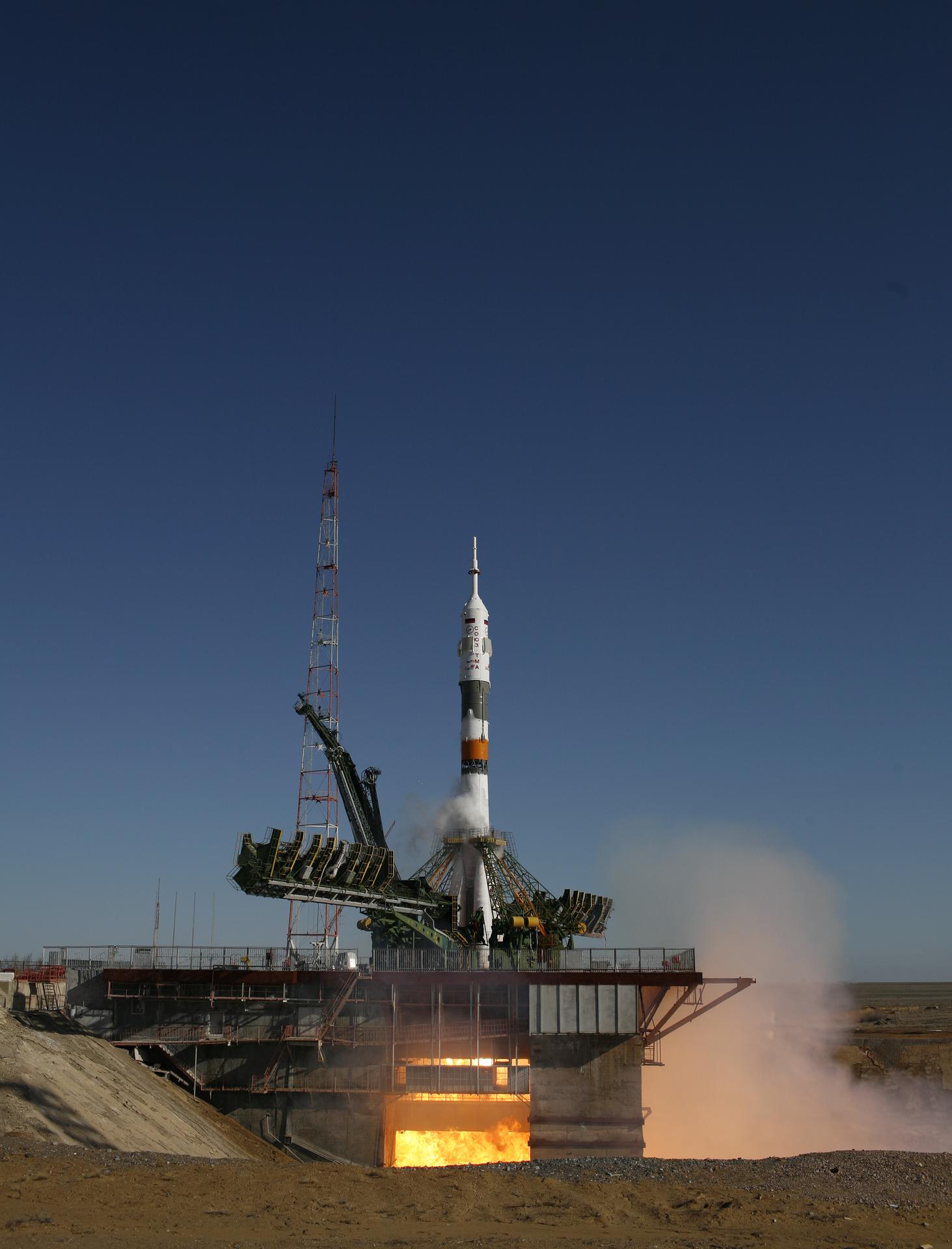 The Soyuz TMA-18 rocket launches from the Baikonur Cosmodrome in Kazakhstan on Friday, April 2, 2010 carrying Expedition 23 Soyuz Commander Alexander Skvortsov of Russia, Flight Engineer Mikhail Kornienko of Russia and NASA Flight Engineer Tracy Caldwell Dyson of the U.S. to the International Space Station. (Photo Credit: NASA/Bill Ingalls/Carla Cioffi)