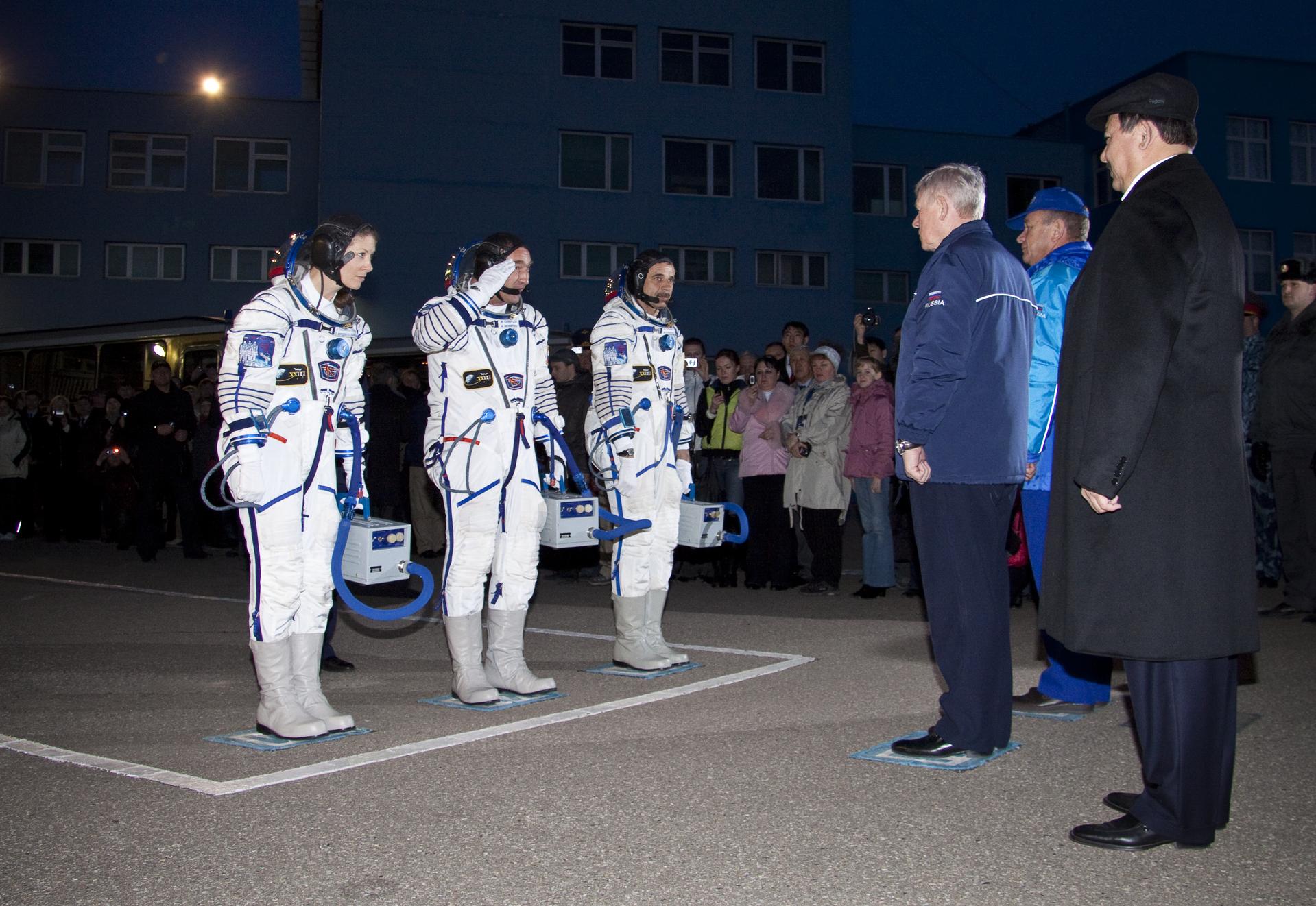 Expedition 23 NASA Flight Engineer Tracy Caldwell Dyson, left, Expedition 23 Soyuz Commander Alexander Skvortsov and Expedition 23 Flight Engineer Mikhail Kornienko, third from left, walk out to salute Head of the Russian Federal Space Agency Anatoly Perminov, third from right, prior to their launch onboard the Soyuz TMA-18 to the International Space Station (ISS), Friday, April 2, 2010 in Baikonur, Kazakhstan. Photo Credit: (NASA/Victor Zelentsov)