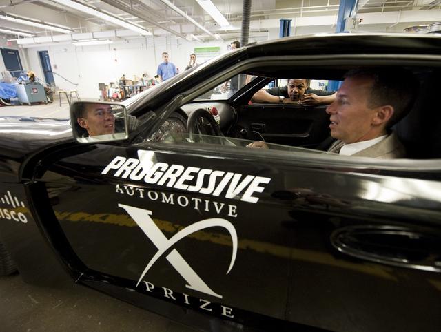 NASA Chief Technologist Bobby Braun sits in the West Philly X Prize hybrid sports car as Sowande Gay, a student member of the West Philly Hybrid Team at West Philadelphia High School, explains the modifications made to the car, in Philadelphia, Monday, June 7, 2010. The prize-winning West Philly Hybrid X Team has drawn international recognition as the only high school among 22 finalists in the Progressive Insurance Automotive X Prize (PIAXP) competition to develop cars that achieve over 100 MPG. Photo Credit: (NASA/Bill Ingalls)