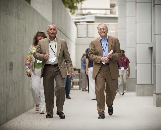 NASA Administrator Charles Bolden, left, and Jet Propulsion Laboratory Director Dr. Charles Elachi lead school students to High Bay One at JPL during the kick off of NASA's Summer of Innovation program at the Jet Propulsion Laboratory in Pasadena, Calif., Thursday, June 10, 2010. Through the program, NASA will engage thousands of middle school students and teachers in stimulating math and science-based education programs with the goal of increasing the number of future scientists, mathematicians, and engineers. Photo Credit: (NASA/Bill Ingalls)