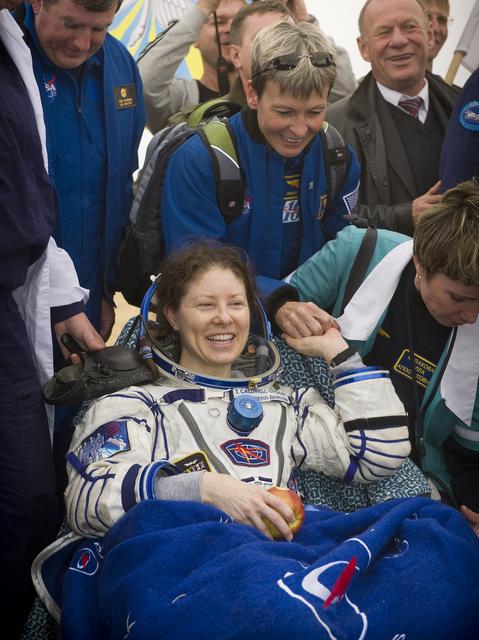 Expedition 24 Flight Engineer Tracy Caldwell Dyson shakes hands with NASA Astronaut and Chief of the Astronaut Office Peggy Whitson shortly after landing in the Soyuz TMA-18 spacecraft with fellow crew members Commander Alexander Skvortsov and Mikhail Kornienko near the town of Arkalyk, Kazakhstan on Saturday, Sept. 25, 2010. Russian Cosmonauts Skvortsov and Kornienko and NASA Astronaut Caldwell Dyson, are returning from six months onboard the International Space Station where they served as members of the Expedition 23 and 24 crews. Photo Credit: (NASA/Bill Ingalls)