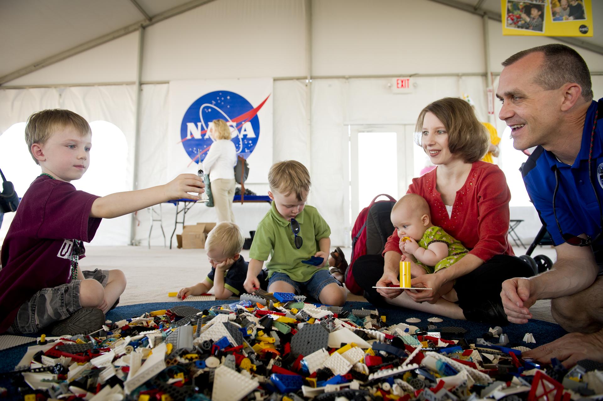 NASA Officials, LEGO Group management, students, teachers and parents create their vision of the future in space with LEGO bricks and elements as part of a “Build the Future” activity inside a tent that was set up on the launch viewing area at NASA's Kennedy Space Center in Cape Canaveral, Fla. on Monday, Nov. 1, 2010. NASA and The LEGO Group signed a Space Act Agreement to spark children's interest in science, technology, engineering and math (STEM). Photo Credit: (NASA/Bill Ingalls)