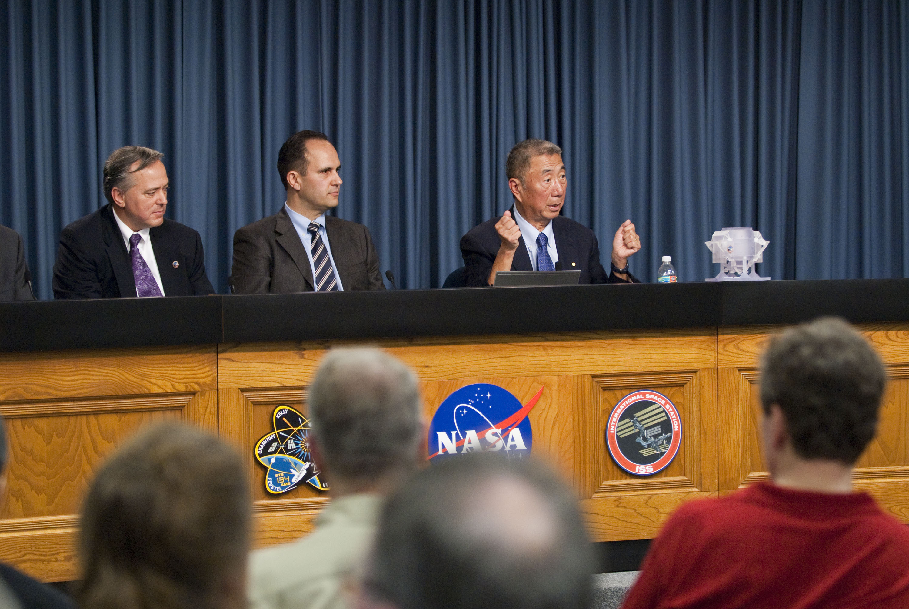 CAPE CANAVERAL, Fla. -- The International Space Station Science and Technology Briefing was held in the Press Site auditorium at NASA's Kennedy Space Center in Florida. Speaking to media about the Alpha Magnetic Spectrometer-2 (AMS) are Mark Sistilli, NASA program manager (left); Saul Gonzales, AMS program manager from the U.S. Department of Energy and Professor Sam Ting, AMS-2 principal investigator at the Massachusetts Institute of Technology. Endeavour and its crew will deliver the Express Logistics Carrier-3, Alpha Magnetic Spectrometer-2 (AMS), a high-pressure gas tank and additional spare parts for the Dextre robotic helper to the International Space Station. Launch is scheduled for April 29 at 3:47 p.m. EDT. This will be the final spaceflight for Endeavour. For more information visit, www.nasa.gov_mission_pages_shuttle_shuttlemissions_sts134_index.html. Photo credit: NASA_Kim Shiflett