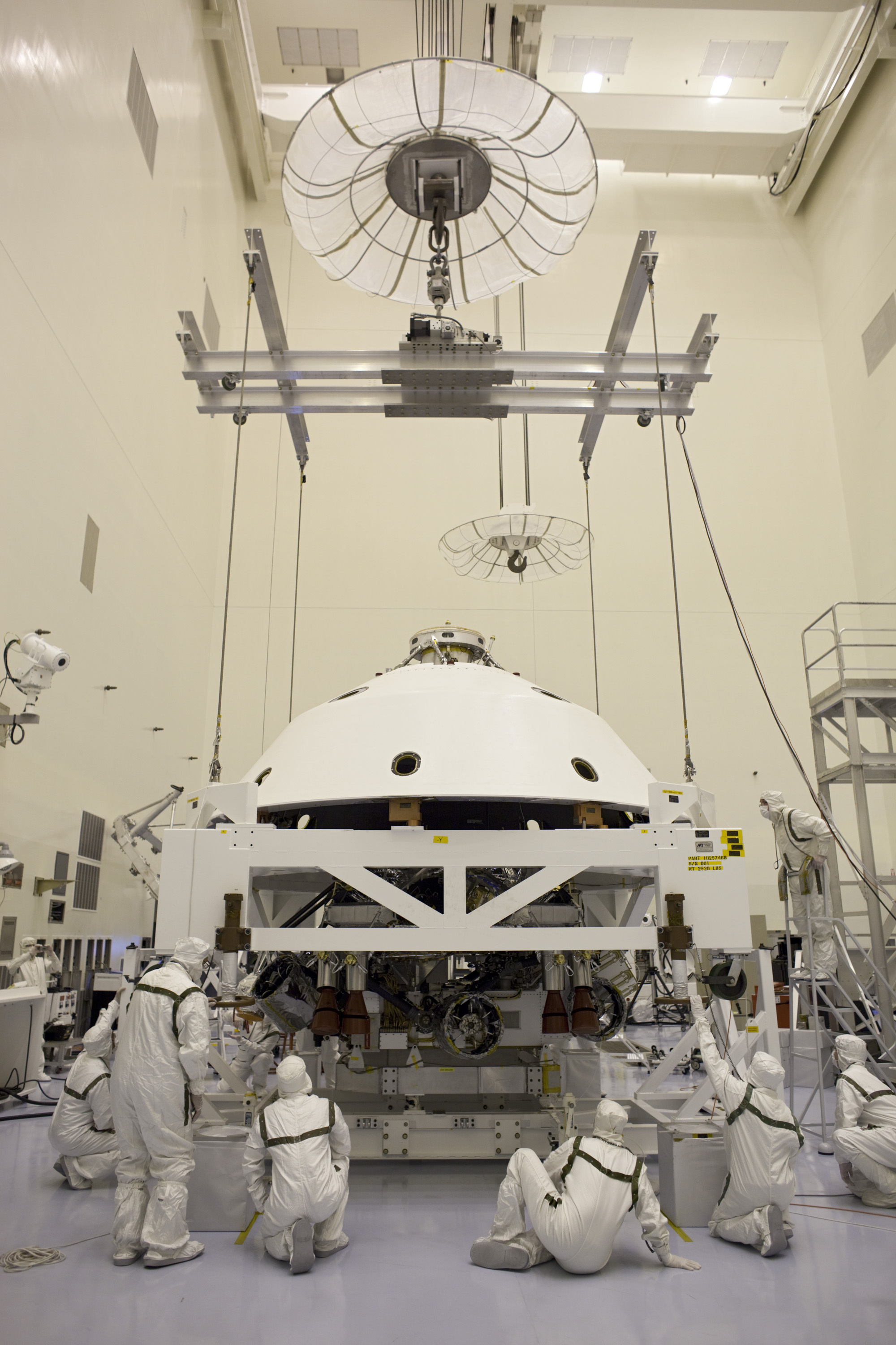 CAPE CANAVERAL, Fla. – In the Payload Hazardous Servicing Facility at NASA's Kennedy Space Center in Florida, technicians guide the backshell as it is lowered over NASA's Mars Science Laboratory (MSL) rover, Curiosity, for encapsulation. The backshell, a protective cover, carries the parachute and several components used during later stages of entry, descent and landing. A United Launch Alliance Atlas V-541 configuration will be used to loft MSL into space. MSL's components include a compact car-sized rover, Curiosity, which has 10 science instruments designed to search for evidence on whether Mars has had environments favorable to microbial life, including chemical ingredients for life. The unique rover will use a laser to look inside rocks and release its gasses so that the rover’s spectrometer can analyze and send the data back to Earth. MSL is scheduled to launch Nov. 25 with a window extending to Dec. 18 and arrival at Mars Aug. 2012. For more information, visit http:__www.nasa.gov_msl. Photo credit: NASA_Dimitri Gerondidakis