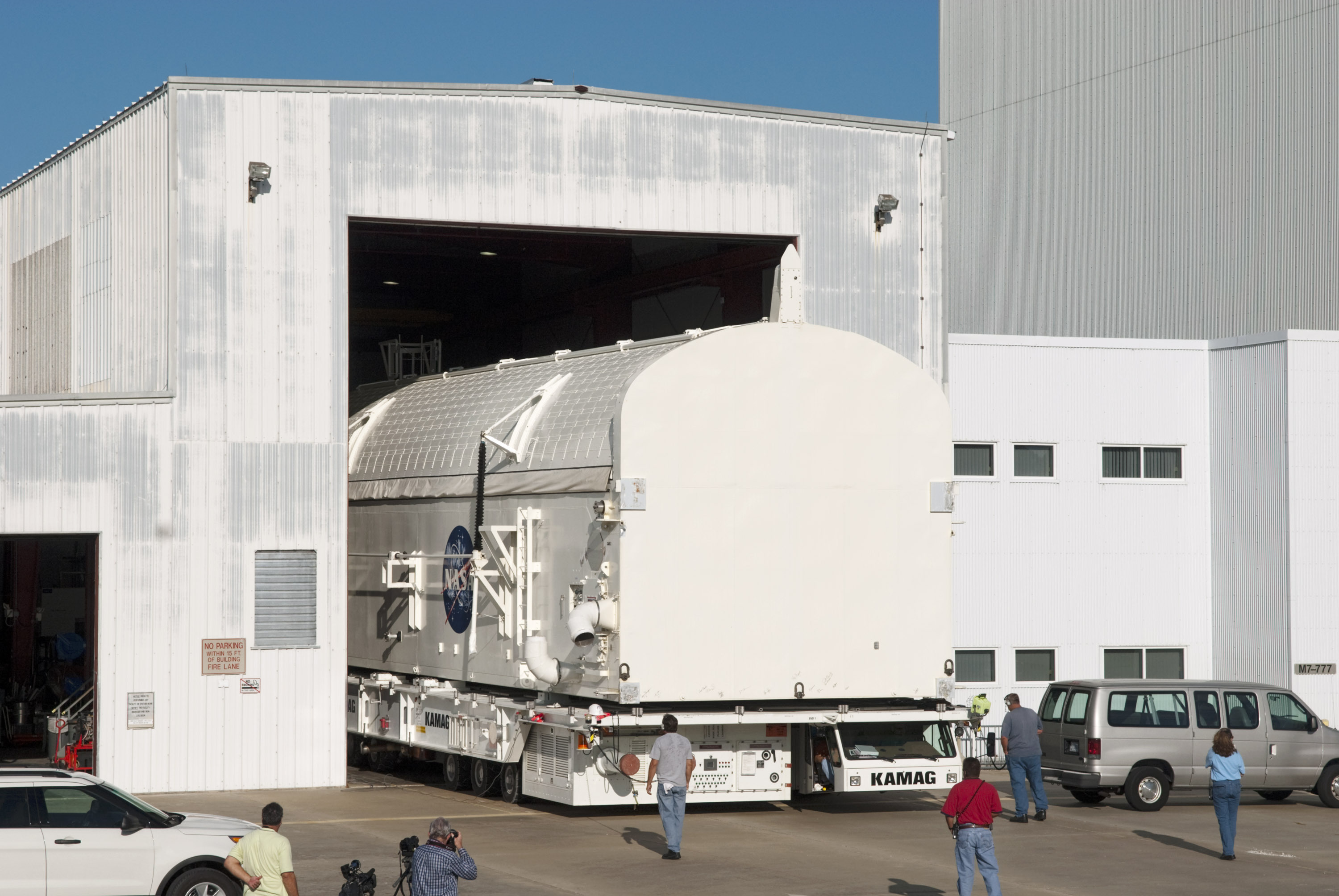 CAPE CANAVERAL, Fla. -- Payload canister #2 rolls out of the high bay of the Canister Rotation Facility at NASA's Kennedy Space Center in Florida on its way to the Reutilization, Recycling and Marketing Facility on Ransom Road. The two payload canisters used to transport space shuttle payloads to the launch pad for installation in the shuttles' cargo bays are being decommissioned following the end of the Space Shuttle Program. Each canister weighs 110,000 pounds and is 65 feet long, 22 feet wide, and 18 feet, 7 inches high. The canisters were prescreened through NASA Headquarters as possible artifacts, but their size makes them difficult to transport to locations off the center. Federal and state agencies now will be given the opportunity to screen the canisters for potential use before a final decision is made on their disposition. For more information, visit http:__www.nasa.gov_centers_kennedy_pdf_167403main_CRF-06.pdf. Photo credit: NASA_Jim Grossmann