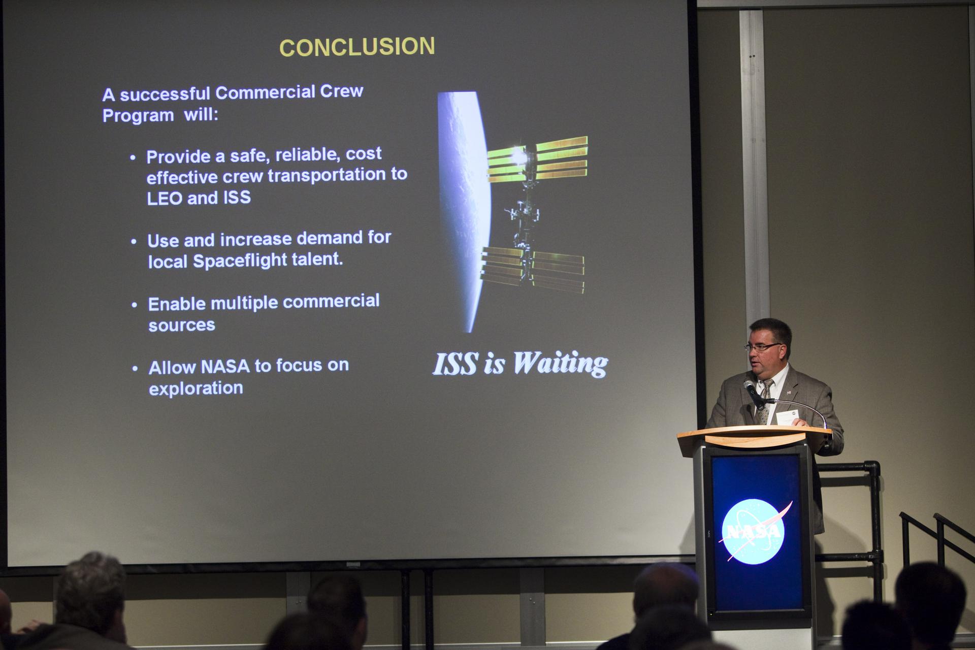 CAPE CANAVERAL, Fla. – Edward Mango, NASA’s Commercial Crew Program manager at Kennedy Space Center, addresses guests at the annual Community Leaders Breakfast held in the Debus Center at Kennedy's Visitor Complex in Florida. Community leaders, business executives, educators, community organizers and state and local government officials heard NASA Administrator Charlie Bolden, Kennedy Space Center Director Bob Cabana, and other senior Kennedy managers provide an overview of the future of the space center. Photo credit: NASA_Dimitri Gerondidakis
