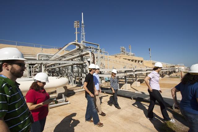 CAPE CANAVERAL, Fla. – Mechanical engineering students from Louisiana State University Christine Woodfield, right, in white shirt, Kevin Schenker, in light blue shirt, and Jacob Koch, in black shirt, joined engineers and scientists at Launch Pad 39B at NASA's Kennedy Space Center in Florida as the students toured the facility to have a look at the flame trench. They went inside the pad structure as part of their insight. The students signed up to help designers looking for new, flame and vibration-resistant materials to line the trench. The students are to build a scaled-down version of the flame trench that Kennedy's scientists can use to try out sample materials for the trench. If the samples work in the lab, they can be tried out in the real flame trenches at Launch Pad 39A and 39B. The launch pad has been refurbished extensively and work is continuing to modify the pad to support a variety of launch vehicles in the future. Photo credit: NASA_Jim Grossmann