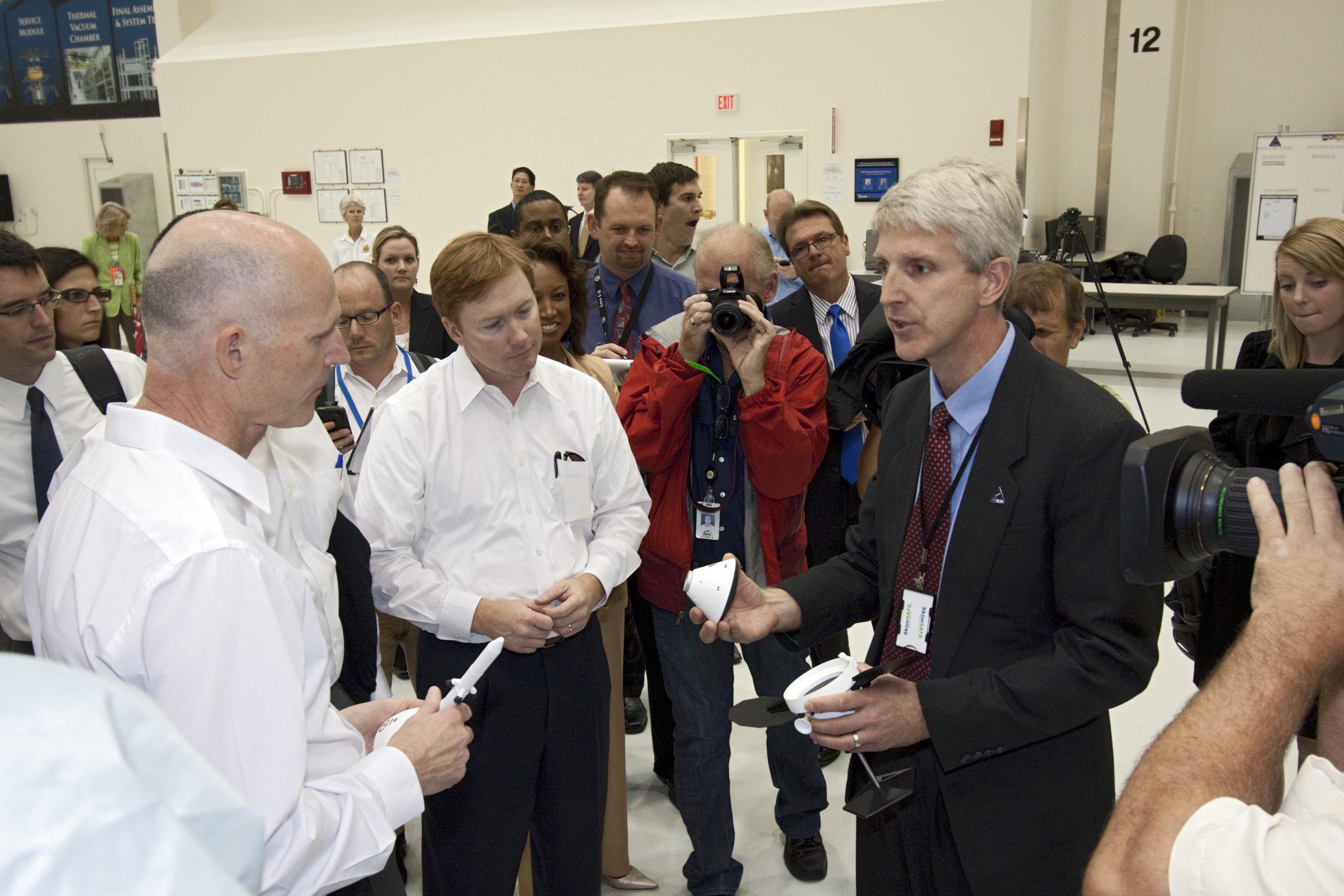 CAPE CANAVERAL, Fla. – In the Operations and Checkout Building at NASA's Kennedy Space Center in Florida, NASA’s Orion Production Manager Scott Wilson, (right), shows Florida Gov. Rick Scott, (left), and Adam Putnam, Florida agriculture commissioner, (center), how an Orion crew exploration vehicle and its launch abort system would be stacked for launch. The governor and other state officials were at Kennedy for a Florida cabinet meeting and a space industry roundtable at the Kennedy Space Center Visitor Complex’s Debus Conference Center. They also toured selected facilities around the center. Photo credit: NASA_Jim Grossmann