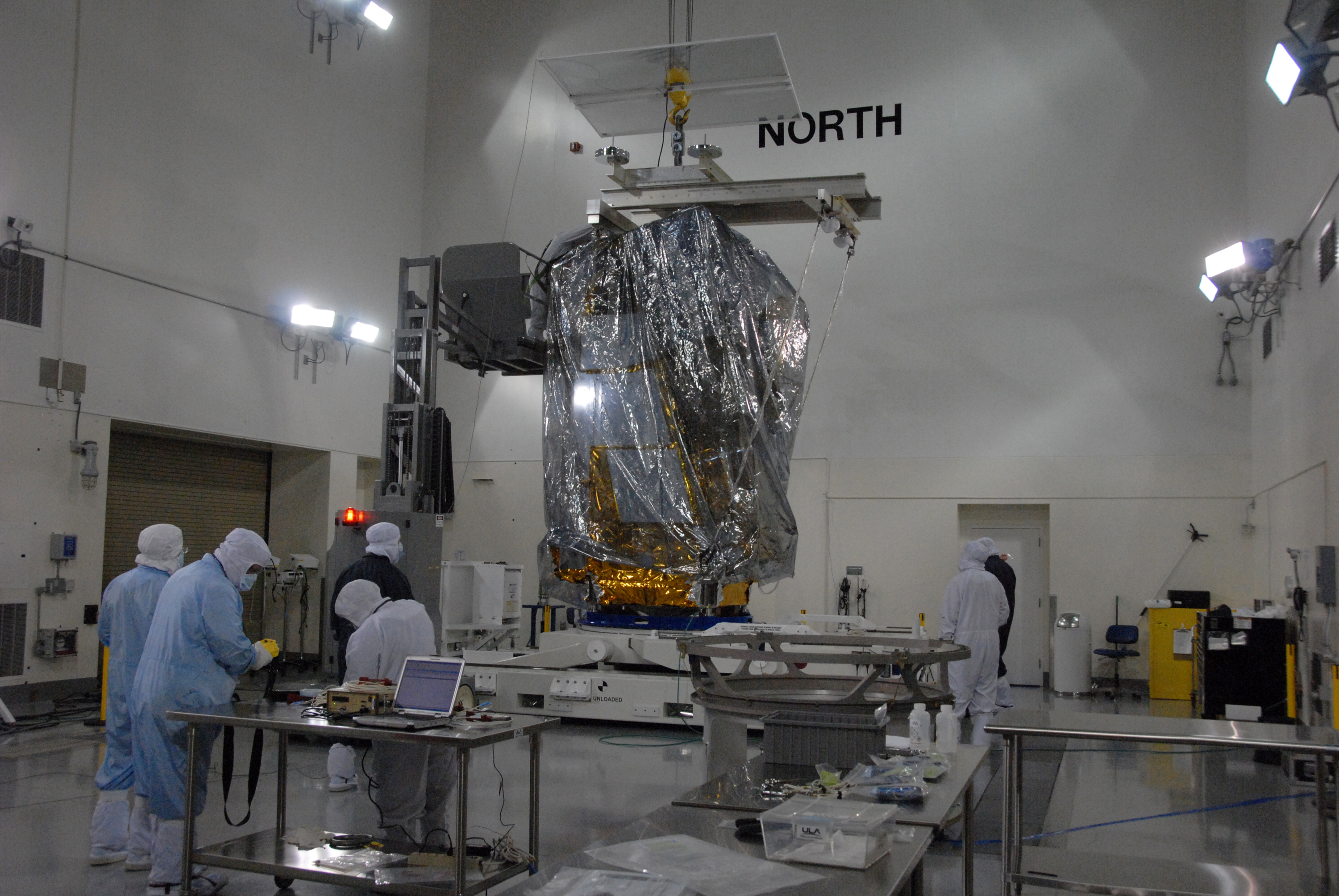 In a clean room inside the Astrotech Payload Processing Facility at Vandenberg Air Force Base in California, Ball Aerospace technicians prepare to attach NASA’s National Polar-orbiting Operational Environmental Satellite System Preparatory Project (NPP) spacecraft to a payload adapter. NPP represents a critical first step in building the next-generation of Earth-observing satellites. NPP will carry the first of the new sensors developed for this satellite fleet, now known as the Joint Polar Satellite System (JPSS), to be launched in 2016. NPP is the bridge between NASA's Earth Observing System (EOS) satellites and the forthcoming series of JPSS satellites. The mission will test key technologies and instruments for the JPSS missions. NPP is targeted to launch Oct. 28 from Space Launch Complex-2 aboard a United Launch Alliance Delta II rocket. For more information, visit http:__www.nasa.gov_NPP. Photo credit: NASA_Roy Allison, VAFB
