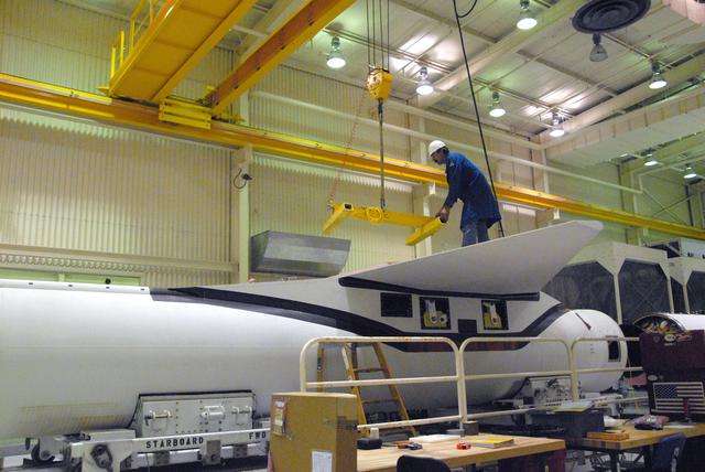 VANDENBERG AIR FORCE BASE, Calif. -- In a processing facility at Vandenberg Air Force Base in California, a technician helps guide a crane away after final wing installation on the Pegasus XL launch vehicle. The Orbital Sciences Corp. Pegasus rocket will launch the Nuclear Spectroscopic Telescope Array (NuSTAR) into space. After the rocket and spacecraft are processed at Vandenberg, they will be flown on the Orbital Sciences’ L-1011 carrier aircraft to the Ronald Reagan Ballistic Missile Defense Test Site at the Pacific Ocean’s Kwajalein Atoll for launch. The high-energy x-ray telescope will conduct a census for black holes, map radioactive material in young supernovae remnants, and study the origins of cosmic rays and the extreme physics around collapsed stars. For more information, visit science.nasa.gov_missions_nustar_. Photo credit: NASA_Randy Beaudoin, VAFB