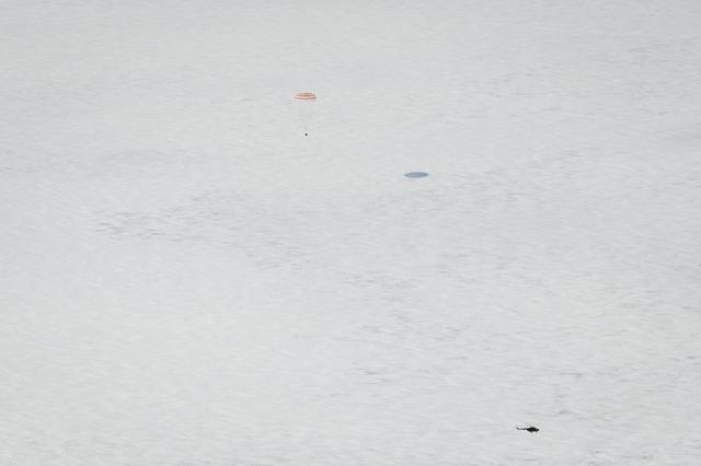 A Russian Search and Rescue helicopter arrives as the Soyuz TMA-01M spacecraft lands with Expedition 26 Commander Scott Kelly and Flight Engineers Oleg Skripochka and Alexander Kaleri near the town of Arkalyk, Kazakhstan on Wednesday, March 16, 2011. NASA Astronaut Kelly, Russian Cosmonauts Skripochka and Kaleri are returning from almost six months onboard the International Space Station where they served as members of the Expedition 25 and 26 crews. Photo Credit: (NASA/Bill Ingalls)