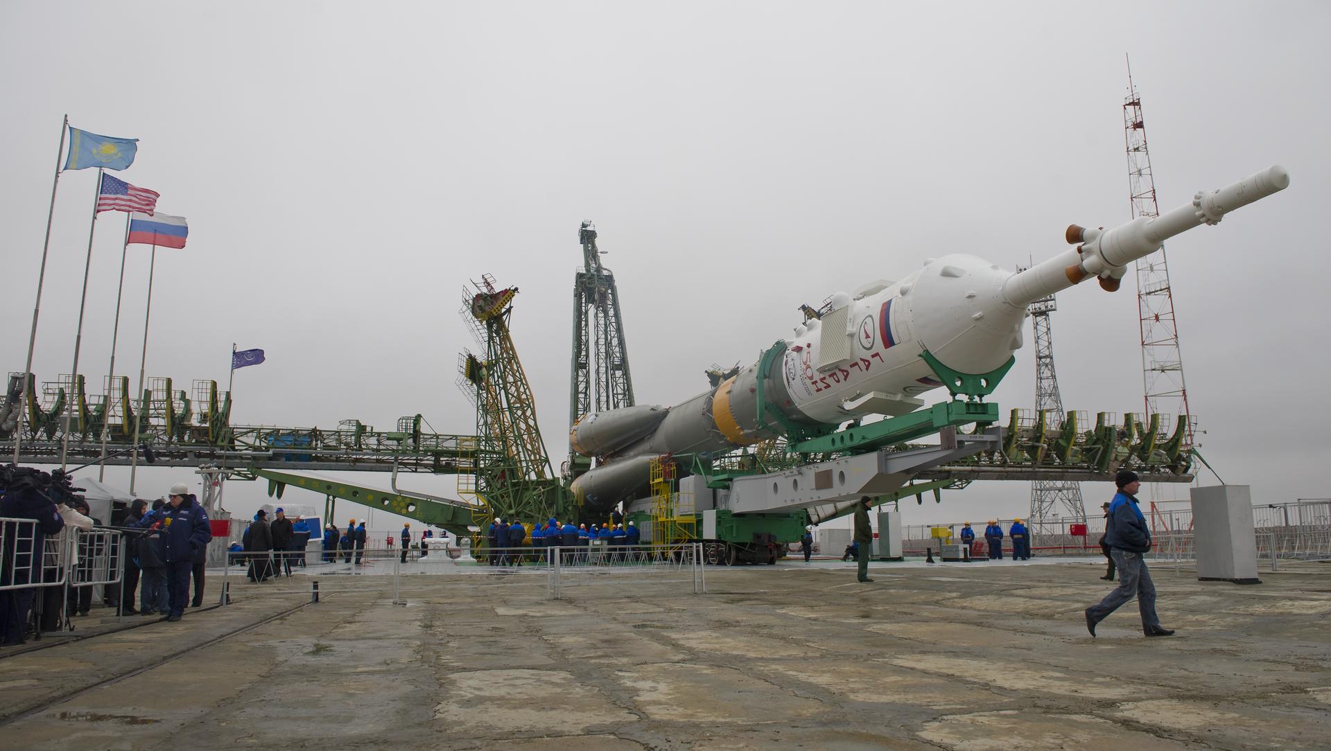 The Soyuz TMA-21 spacecraft is seen shortly after arriving at the launch pad Saturday, April 2, 2011 at the Baikonur Cosmodrome in Kazakhstan. The Soyuz, which has been dubbed “Gagarin”, is launching one week shy of the 50th anniversary of the launch of Yuri Gagarin from the same launch pad in Baikonur on April 12, 1961 to become the first human to fly in space. The first stage of the Soyuz booster is emblazoned with the name “Gagarin” and the likeness of the first person to fly in space. Photo Credit (NASA/Carla Cioffi)