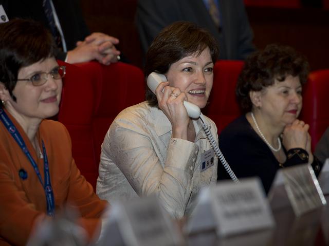 Carmel Garan, center, wife of Expedition 27 NASA Flight Engineer Ron Garan, is seen at Russian Mission Control in Korolev, Russia speaking to her husband shortly after his arrival at the International Space Station on Thursday, April 7, 2011. Photo Credit: (NASA/Carla Cioffi)