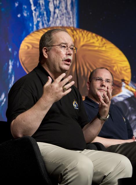 Eric Lindstrom, left, Aquarius Program Scientist, NASA Headquarters, talks about NASA's Aquarius/SAC-D mission to study the salinity of Earth's oceans from space on Tuesday, May 17, 2011 at NASA Headquarters in Washington. The mission is a collaboration between NASA and Argentina's space agency Comision Nacional de Actividades Especiales (CONAE), with participation from Brazil, Canada, France and Italy. The Aquarius/SAC-D observatory will launch June 9, 2011 from Vandenberg Air Force Base in California. Photo Credit: (NASA/Carla Cioffi)