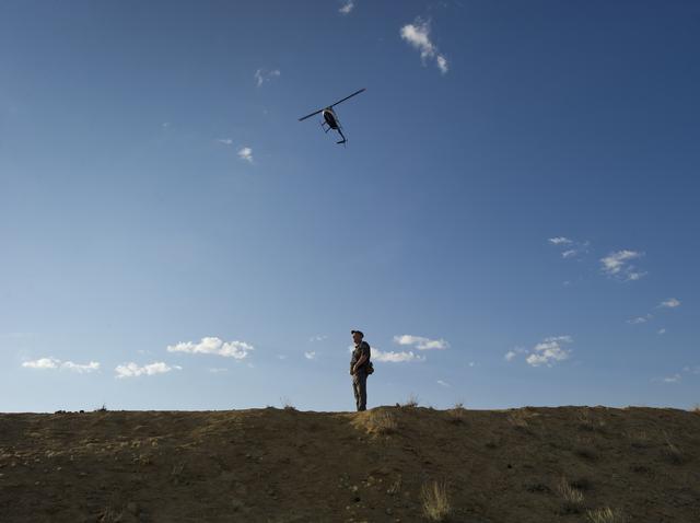 A Russian security guard stands watch as a Russian military helicopter flies overhead during the rollout of the Soyuz TMA-02M rocket to the launch pad at the Baikonur Cosmodrome in Kazakhstan on Sunday, June 5, 2011. Photo Credit: (NASA/Carla Cioffi)