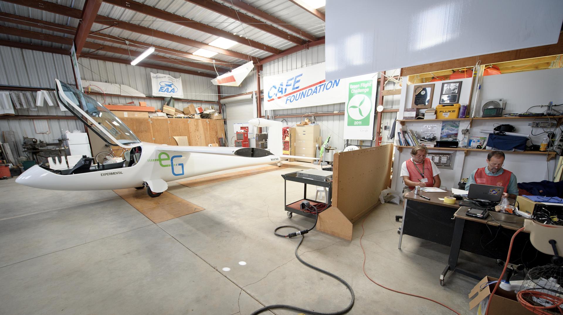 CAFE Foundation Weights crew member Ron Stout, left, and Weights Chief Wayne Cook, weigh-in the e-Genius aircraft during the 2011 Green Flight Challenge, sponsored by Google, at the Charles M. Schulz Sonoma County Airport in Santa Rosa, Calif. on Monday, Sept. 26, 2011. NASA and the Comparative Aircraft Flight Efficiency (CAFE) Foundation are having the challenge with the goal to advance technologies in fuel efficiency and reduced emissions with cleaner renewable fuels and electric aircraft. Photo Credit: (NASA/Bill Ingalls)