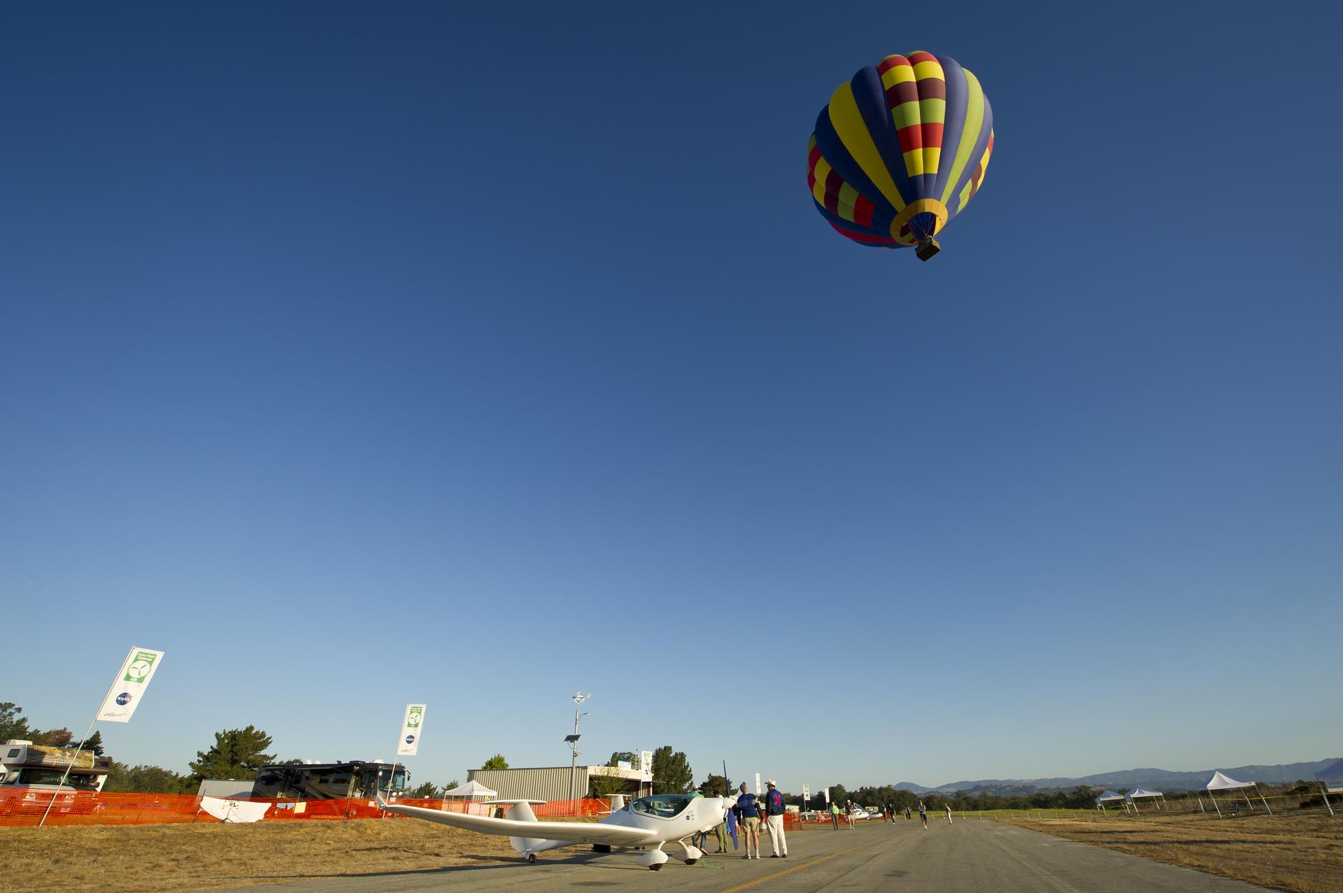 A hot air balloon passes over the campus of the 2011 Green Flight Challenge, sponsored by Google, at the Charles M. Schulz Sonoma County Airport in Santa Rosa, Calif. on Thursday, Sept. 29, 2011. NASA and the Comparative Aircraft Flight Efficiency (CAFE) Foundation are having the challenge with the goal to advance technologies in fuel efficiency and reduced emissions with cleaner renewable fuels and electric aircraft. Photo Credit: (NASA/Bill Ingalls)