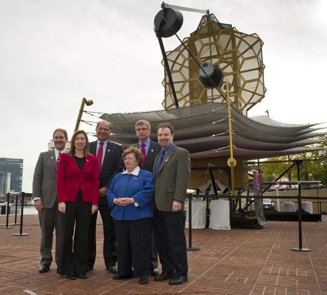 NASA, space science industry and government officials are seen in front of a full-size model of NASA's James Webb Space Telescope at the Maryland Science Center in Baltimore, Wednesday, Oct. 26, 2011. From left, back row are: Dr. John Grunsfeld, former astronaut and Deputy Director, Space Telescope Science Institute (STScI), Baltimore; Jeffrey Grant, VP and General Manager of the Space Systems Division, Northrop Grumman; Van Reiner, President and CEO of the Maryland Science Center, Baltimore and Adam Reiss, recipient of the 2011 Nobel Prize in Physics and professor of astronomy and physics at Johns Hopkins University. In the front row are NASA Deputy Administrator Lori Garver, left, and U.S. Senator Barbara Mikulski (D-Md.). Photo Credit: (NASA/Carla Cioffi)